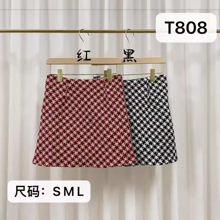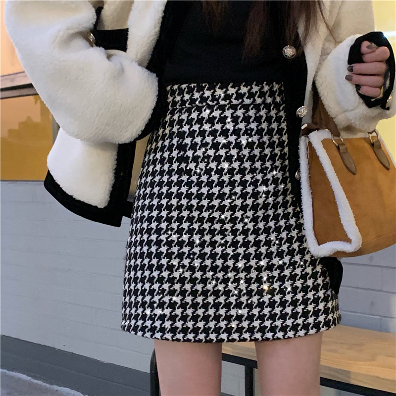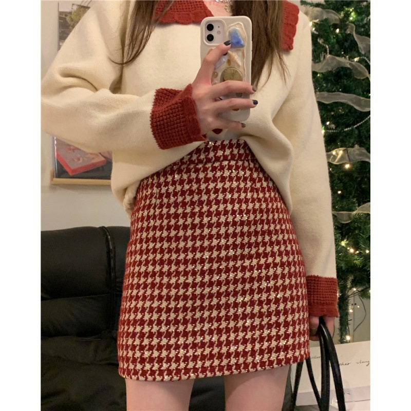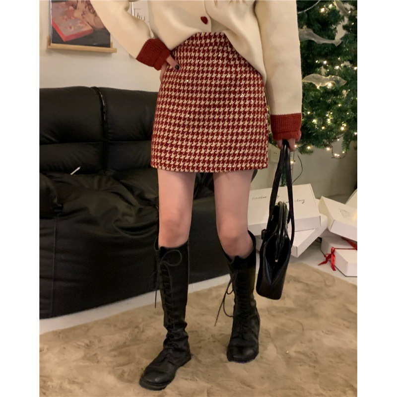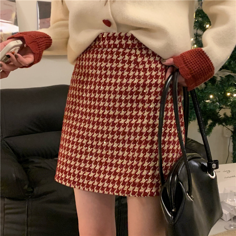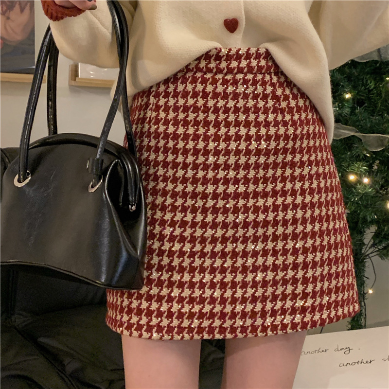 Главная страница > Рождественская и новогодняя красная клетчатая юбка для женщин на осень и зиму, небольшой ароматный стиль, завышенная талия, утягивающая шерстяная юбка А-силуэта с узором «гусиные лапки»