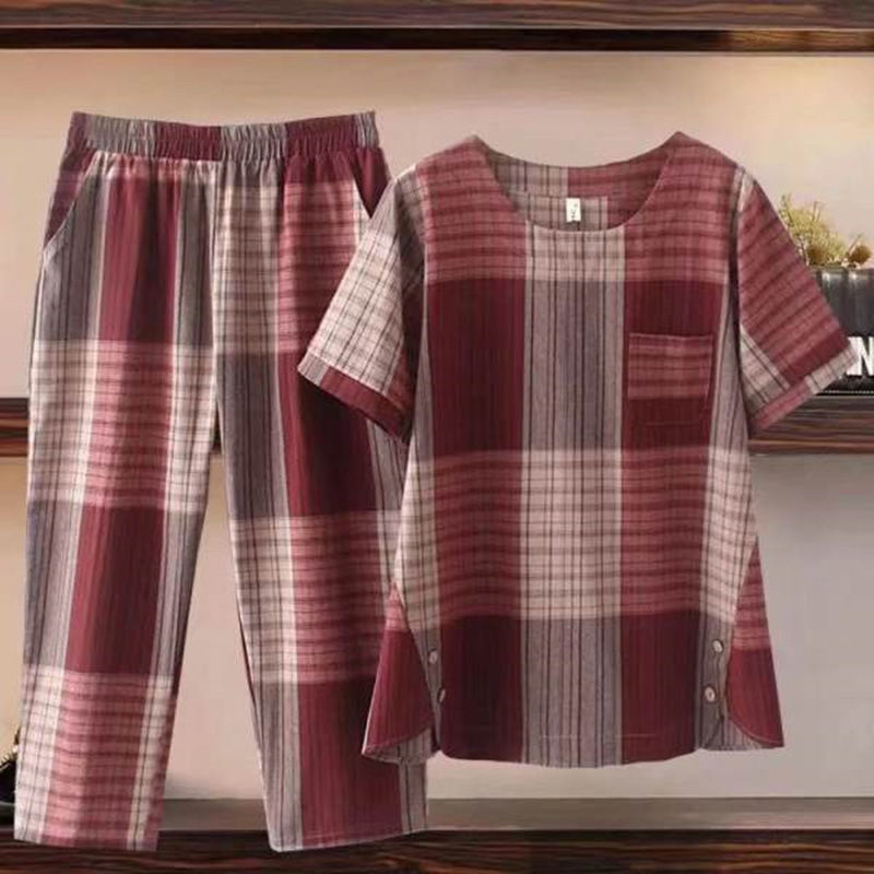 Главная страница > Костюм женский для мамы установлен Корейский Летний New plus size плед двойка повседневные брюки Свободный Топ женский