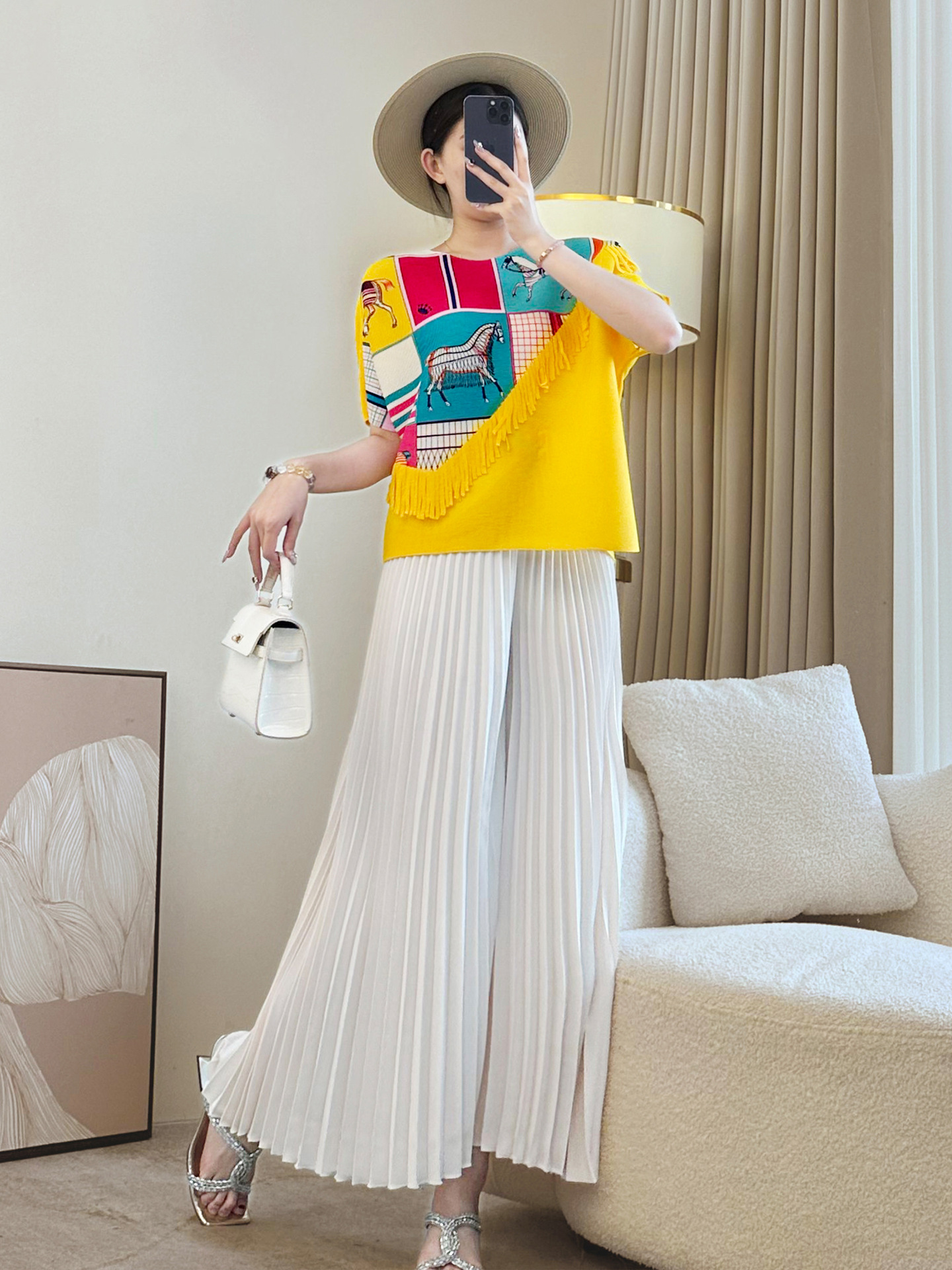 Главная страница > Цельная женская футболка с кисточками Miyake, с короткими рукавами, весенне-летняя новая свободная плиссированная футболка с круглым вырезом и принтом для похудения, женская футболка