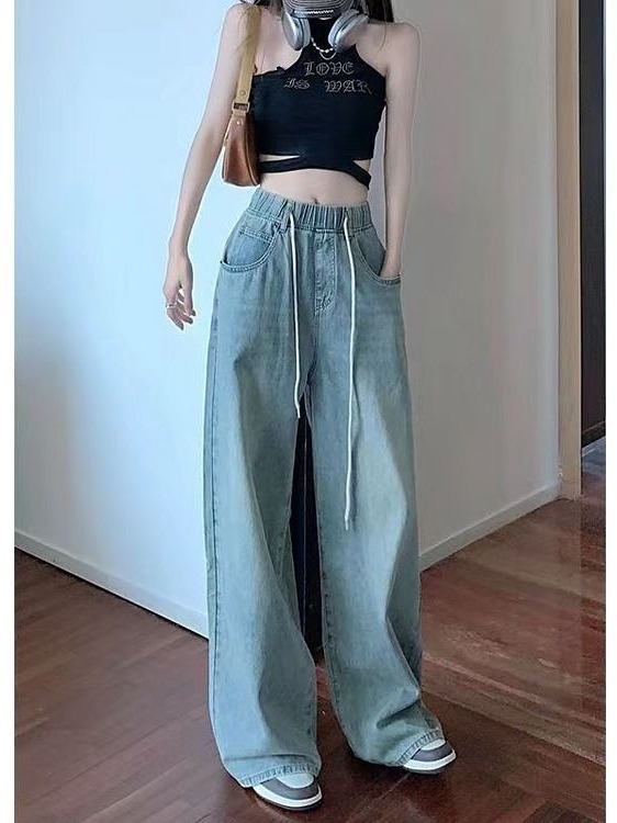 Главная страница > Джинсы с эластичной талией в стиле ретро для женщин на весну и лето в Корейском стиле с высокой талией для похудения прямые широкие брюки со шваброй для студентов