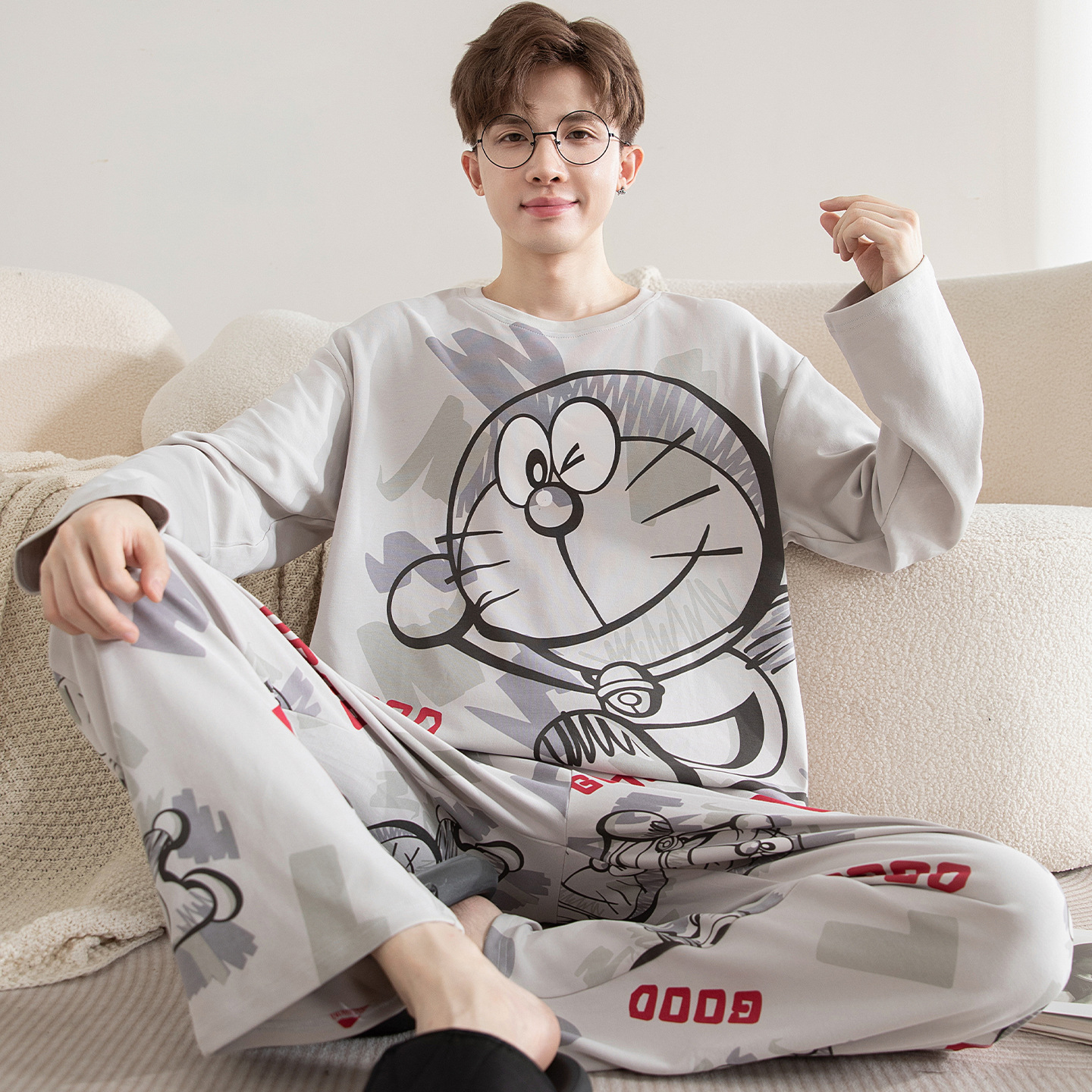 Хлопчатобумажная пижама мужская весна и осень с круглым вырезом с длинными рукавами брюки большого размера мультфильм подросток может носить костюм на дому