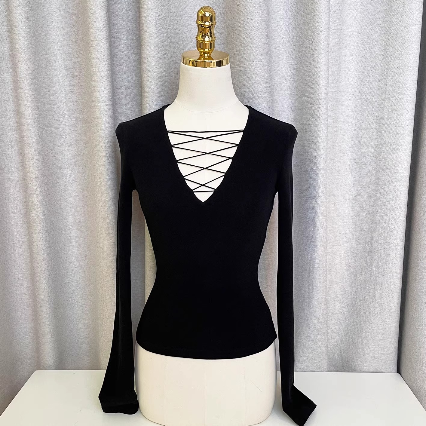 Главная страница > Официальное изображение и реальная цена, черная футболка с v-образным вырезом и длинными рукавами, женская облегающая эластичная элегантная сексуальная внутренняя футболка