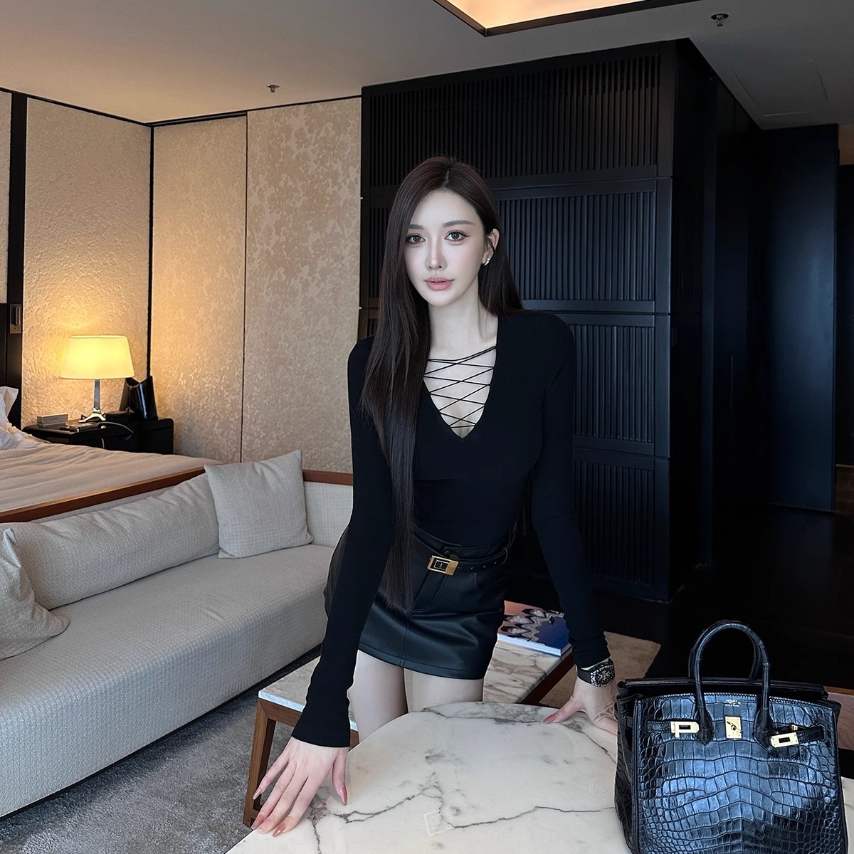 Официальное изображение и реальная цена, черная футболка с v-образным вырезом и длинными рукавами, женская облегающая эластичная элегантная сексуальная внутренняя футболка