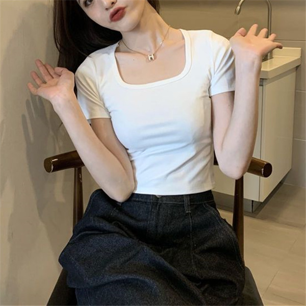 Главная страница > Эластомерный хлопок чистый ветер U-образный воротник футболка с короткими рукавами женская стройная летняя тонкая пряная девушка