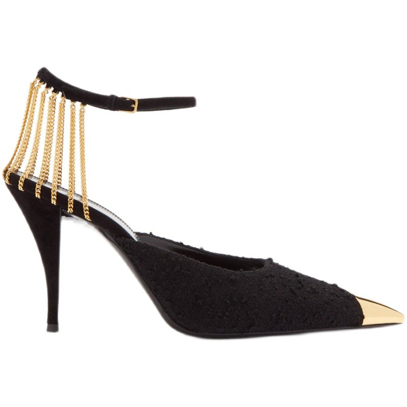 Главная страница > Черные туфли на высоком каблуке, весна 2024, новые, с заостренным носком, металлической цепочкой, женские босоножки на одной лямке, сексуальные туфли-стилеты.