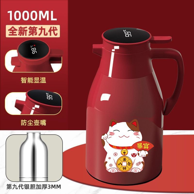 Красный термос-чайник с цифровым дисплеем, объем 1,0 л + наклейка с изображением удачливого кота
