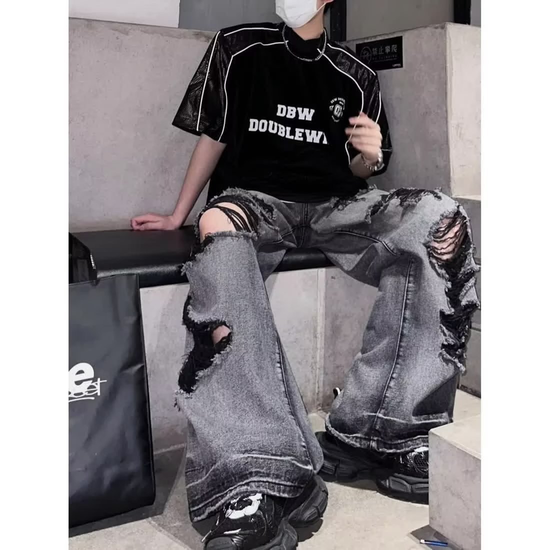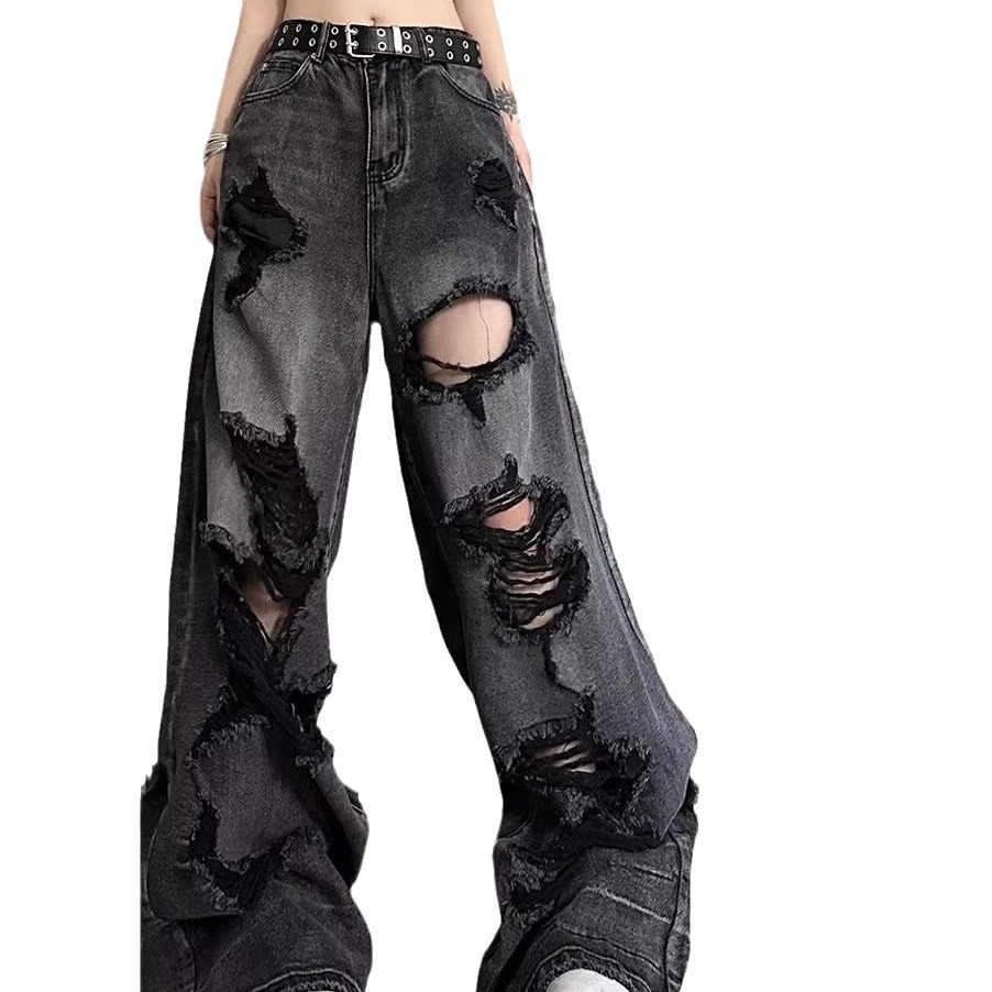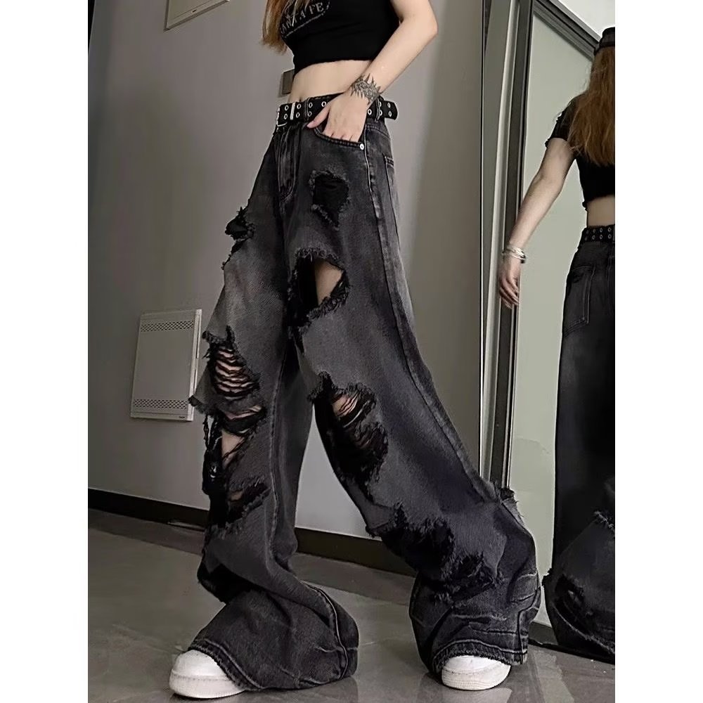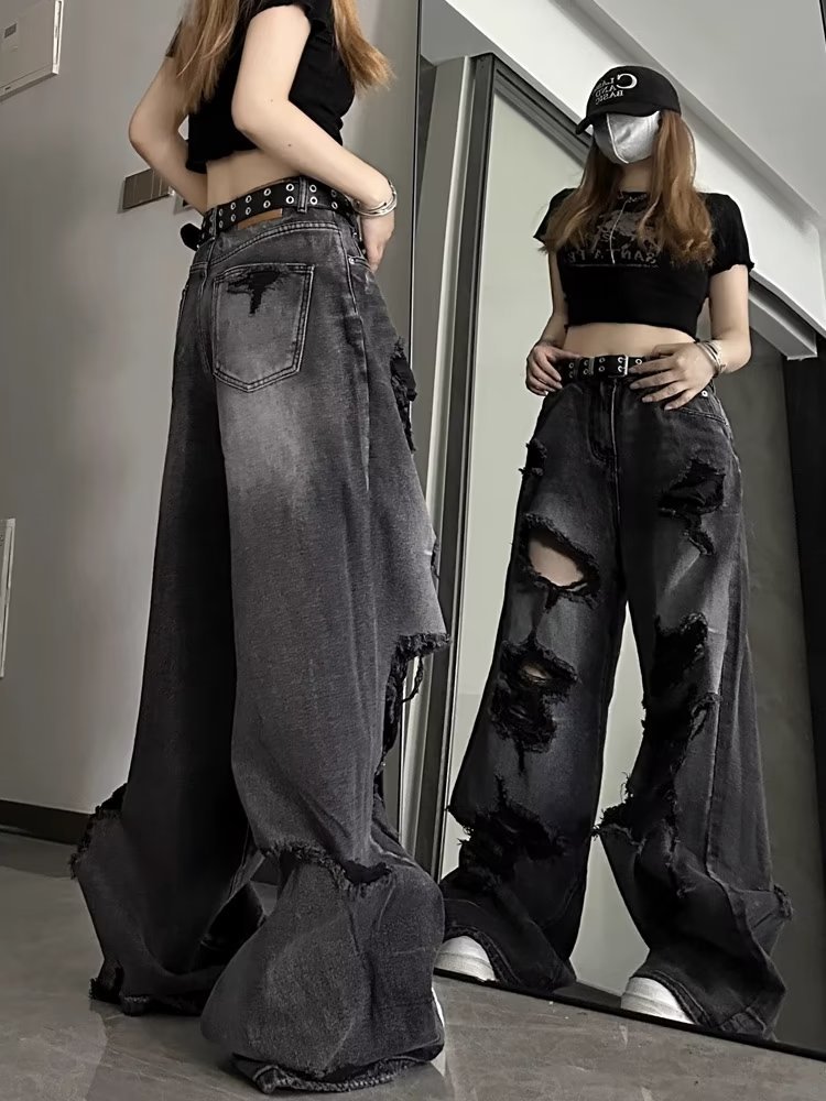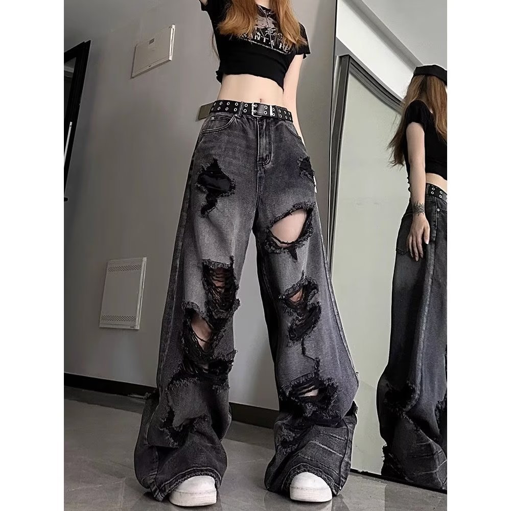 Главная страница > Рваные джинсы, крутая девушка, носит американские свободные прямые универсальные широкие брюки в форме груши, весна и осень