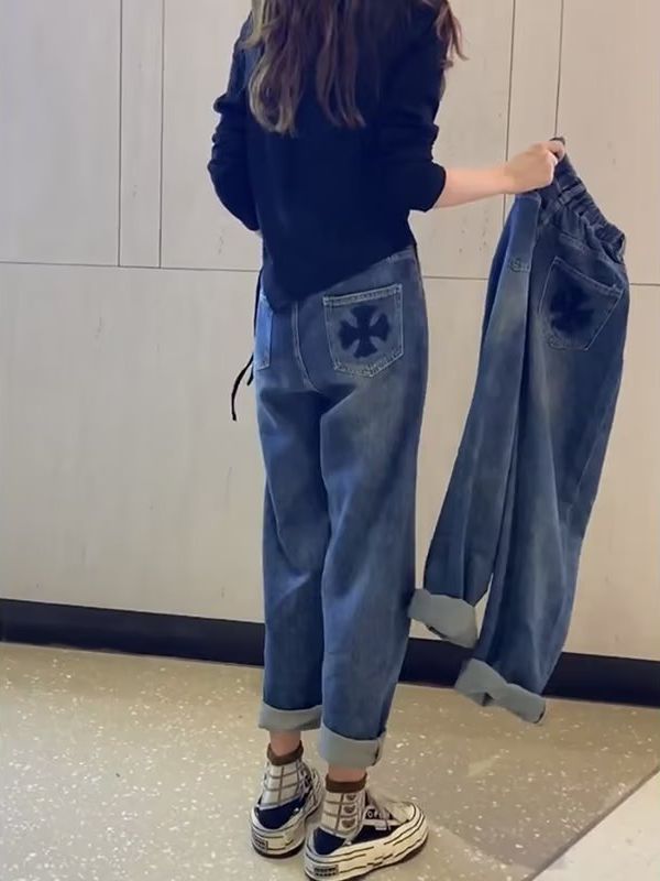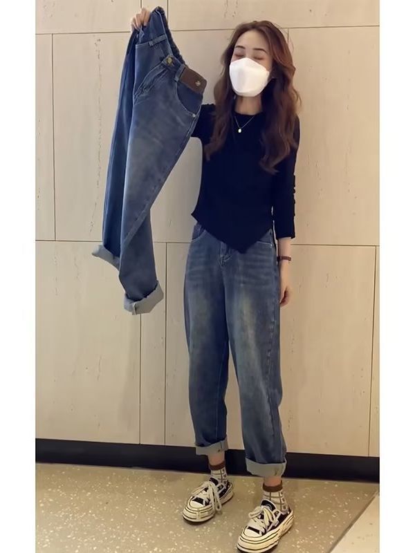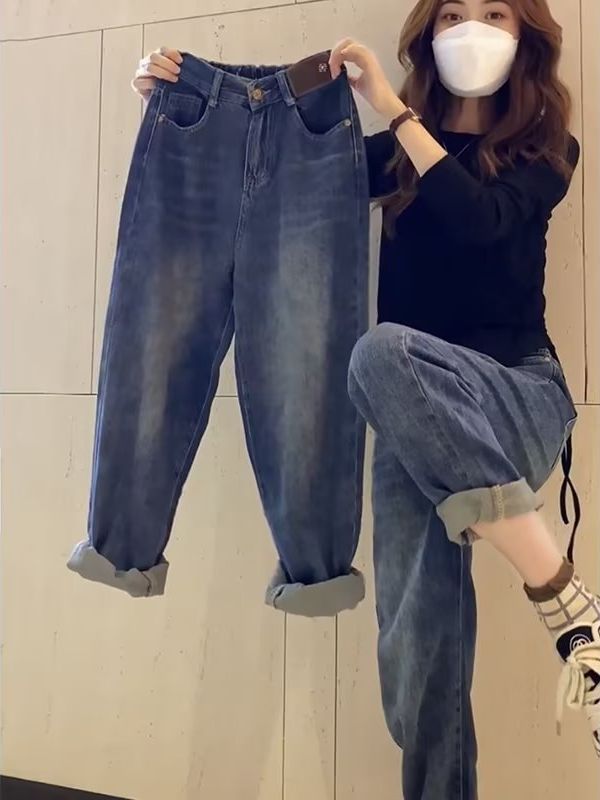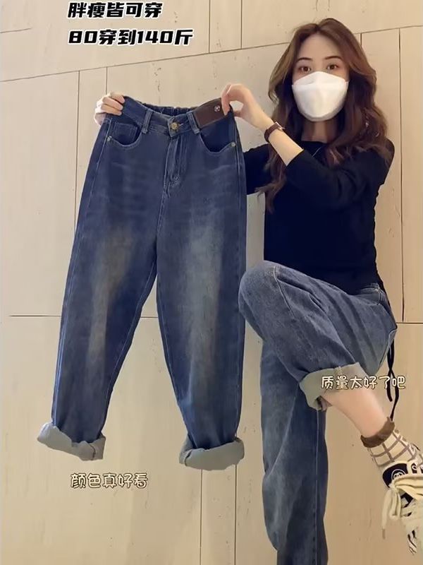 Главная страница > Большой размер толстая сестра с высокой талией прямые джинсы женские весенние и осенние свободные тонкие повседневные дикие брюки из редьки Харуна