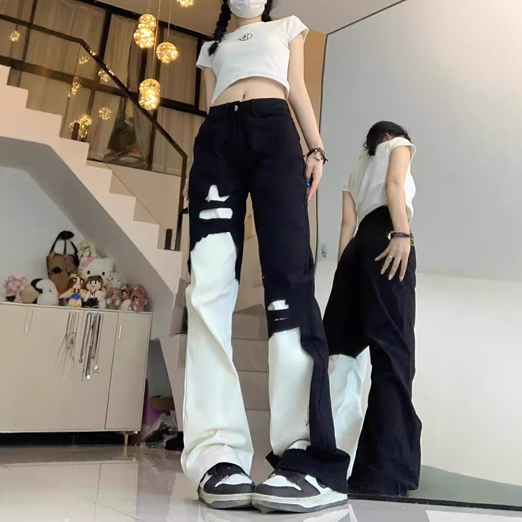 Побочные джинсы новые дыры черно-белые свободные прямые брюки