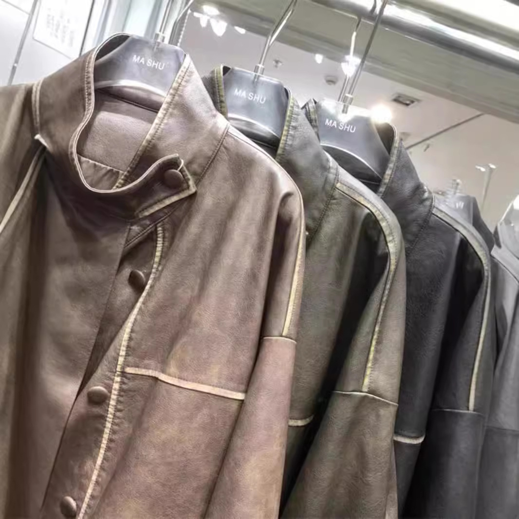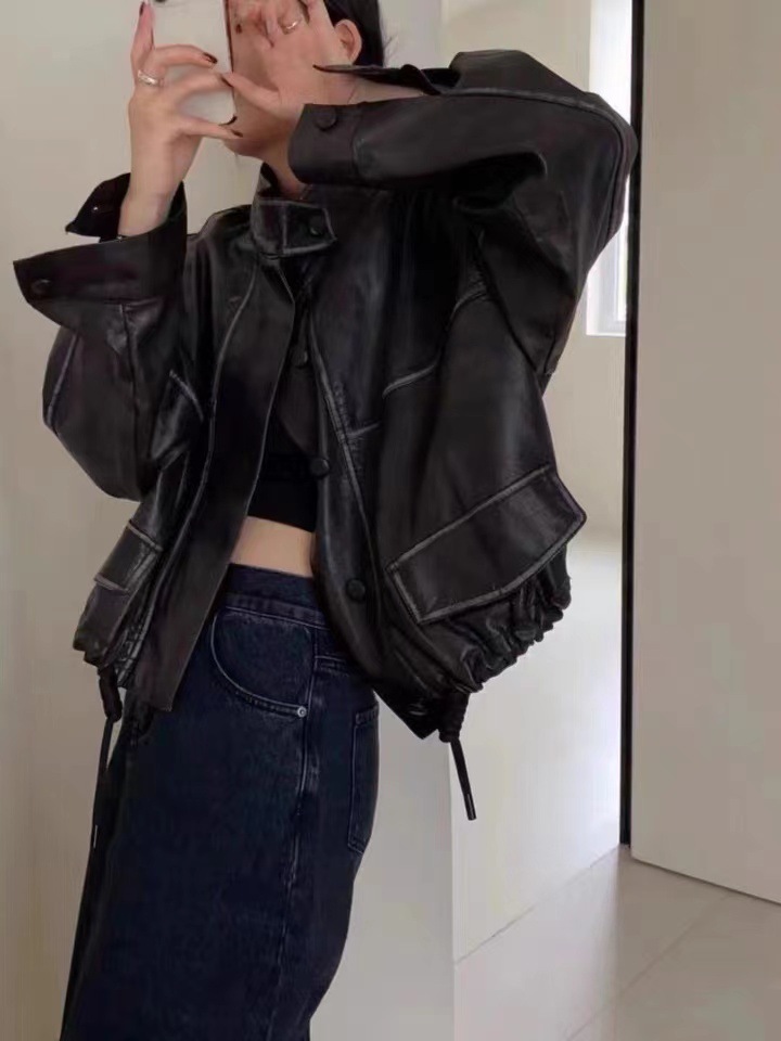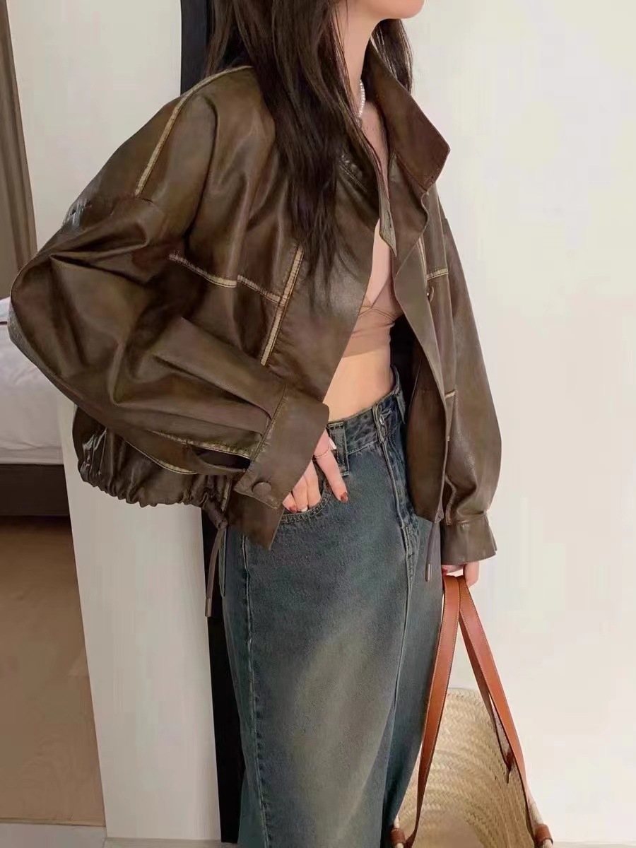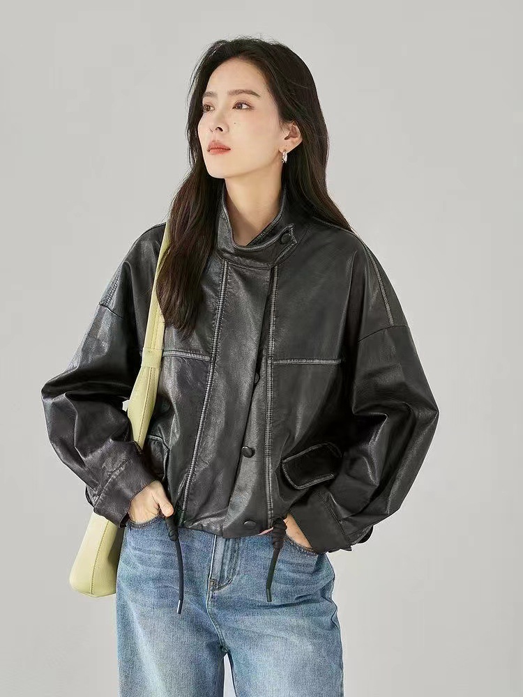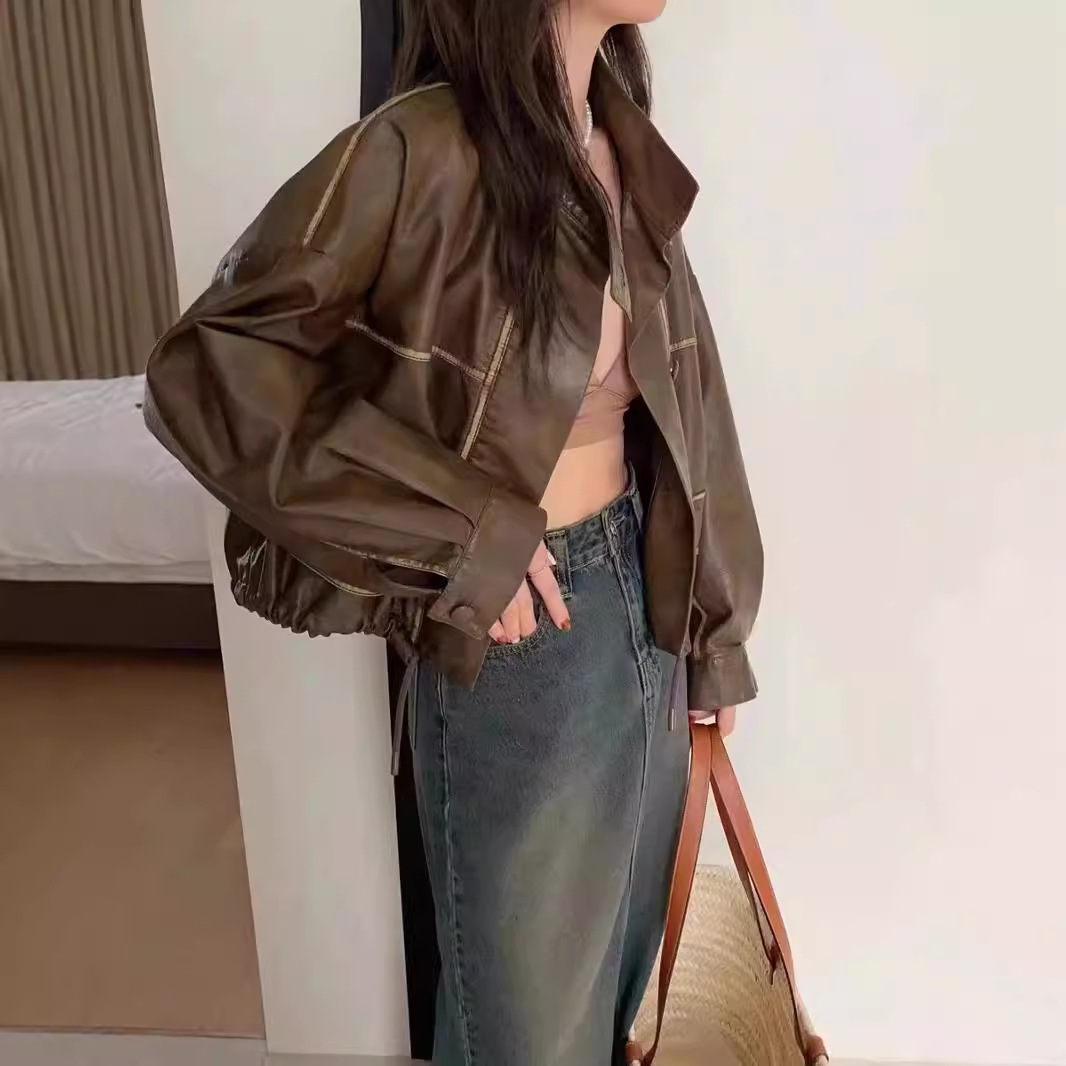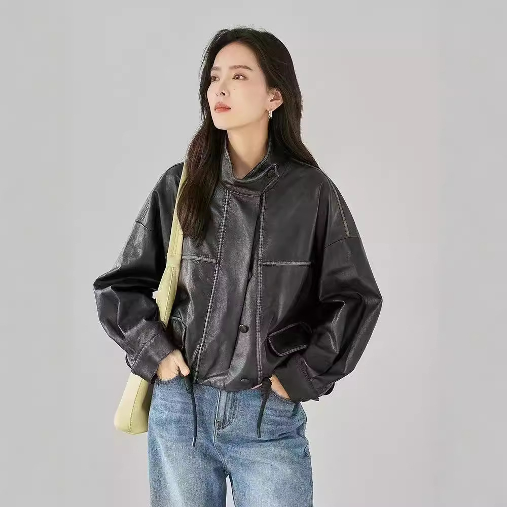 Главная страница > Элегантный короткий женский плащ с воротником-стойкой, новая осенняя кожаная куртка 2024 года с завязками, в стиле для поездок на работу.