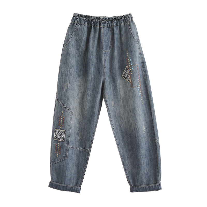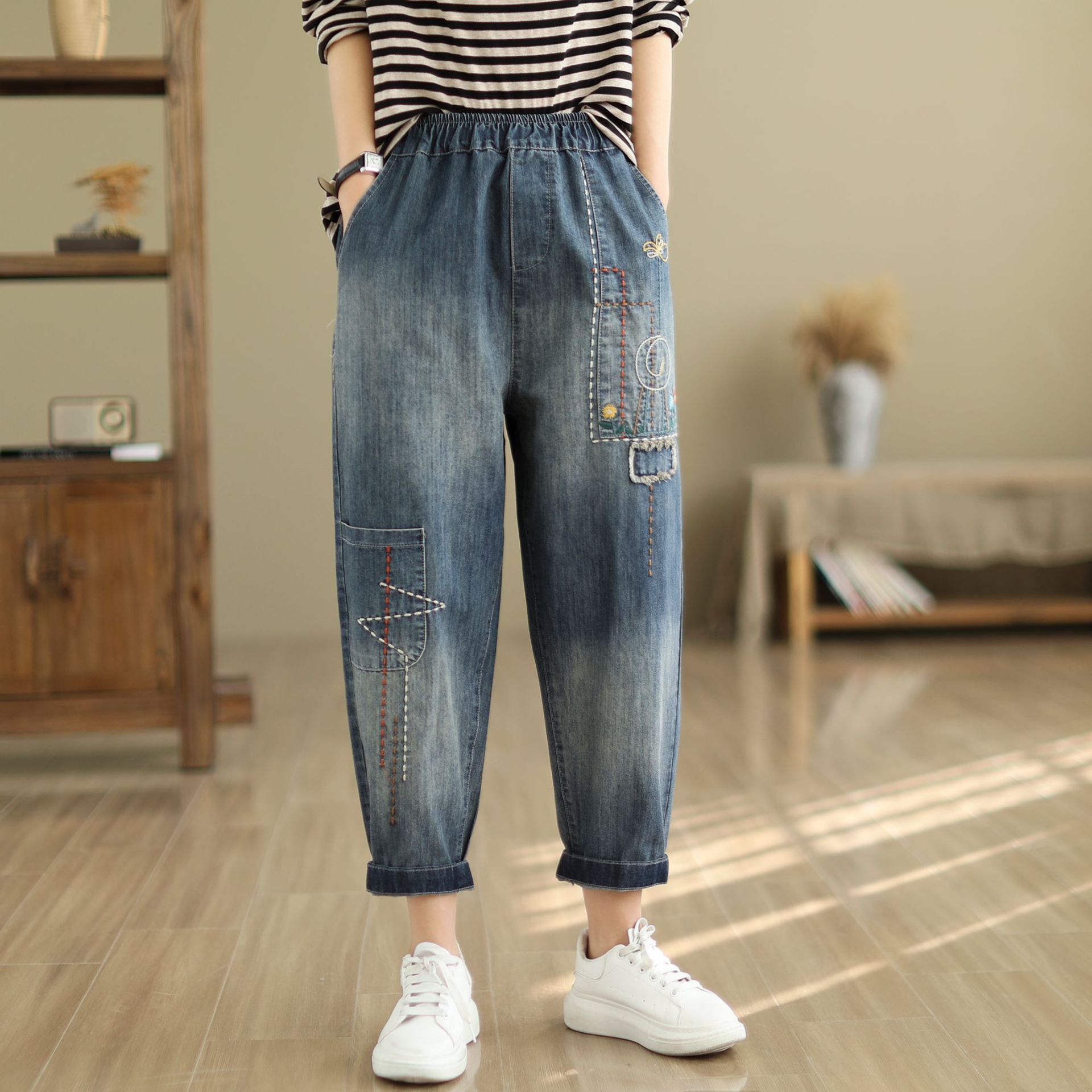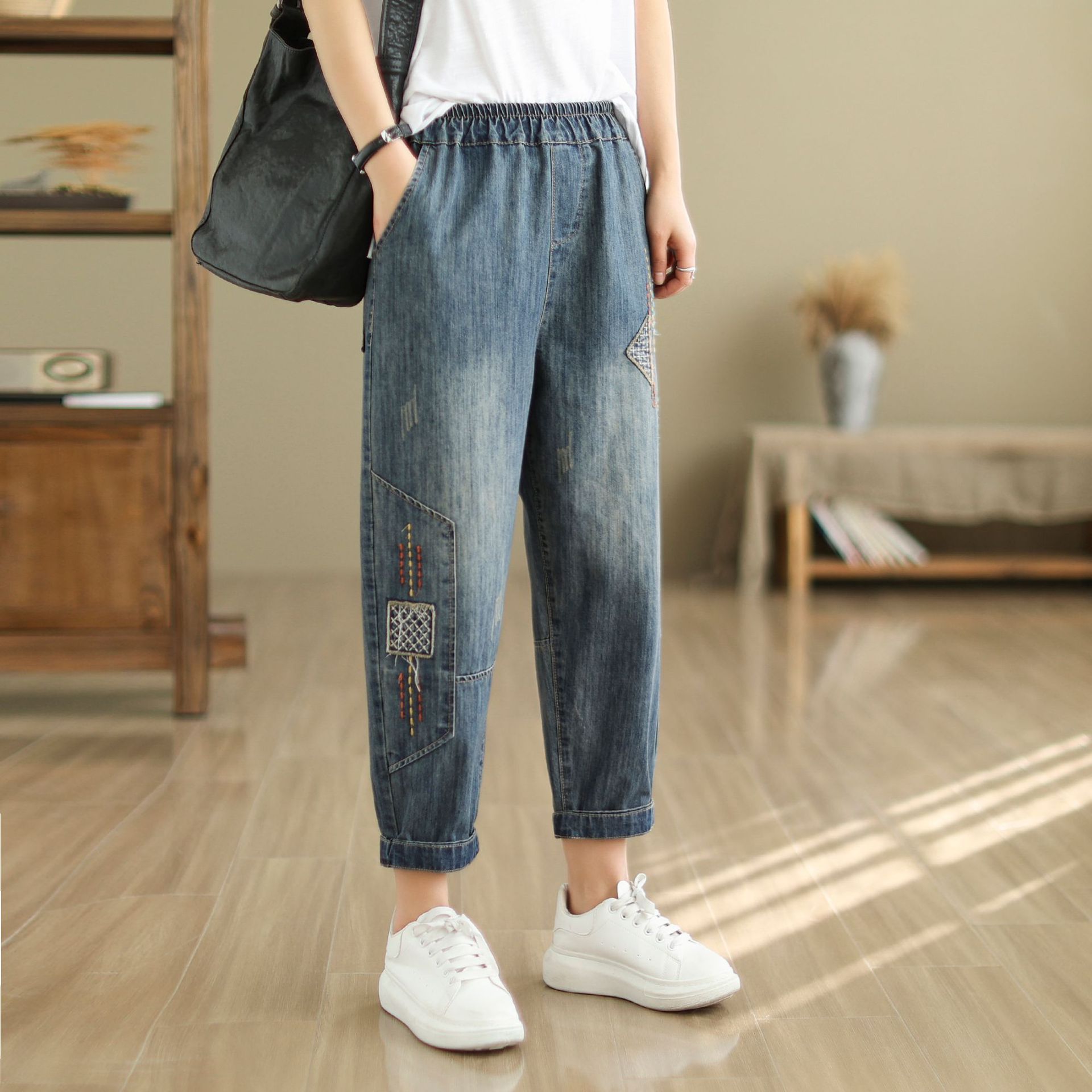 Главная страница > Весной и летом новые повседневные шаровары для папы, женские Тяжелые Вышитые художественные женские укороченные брюки, свободные джинсы больших размеров для женщин