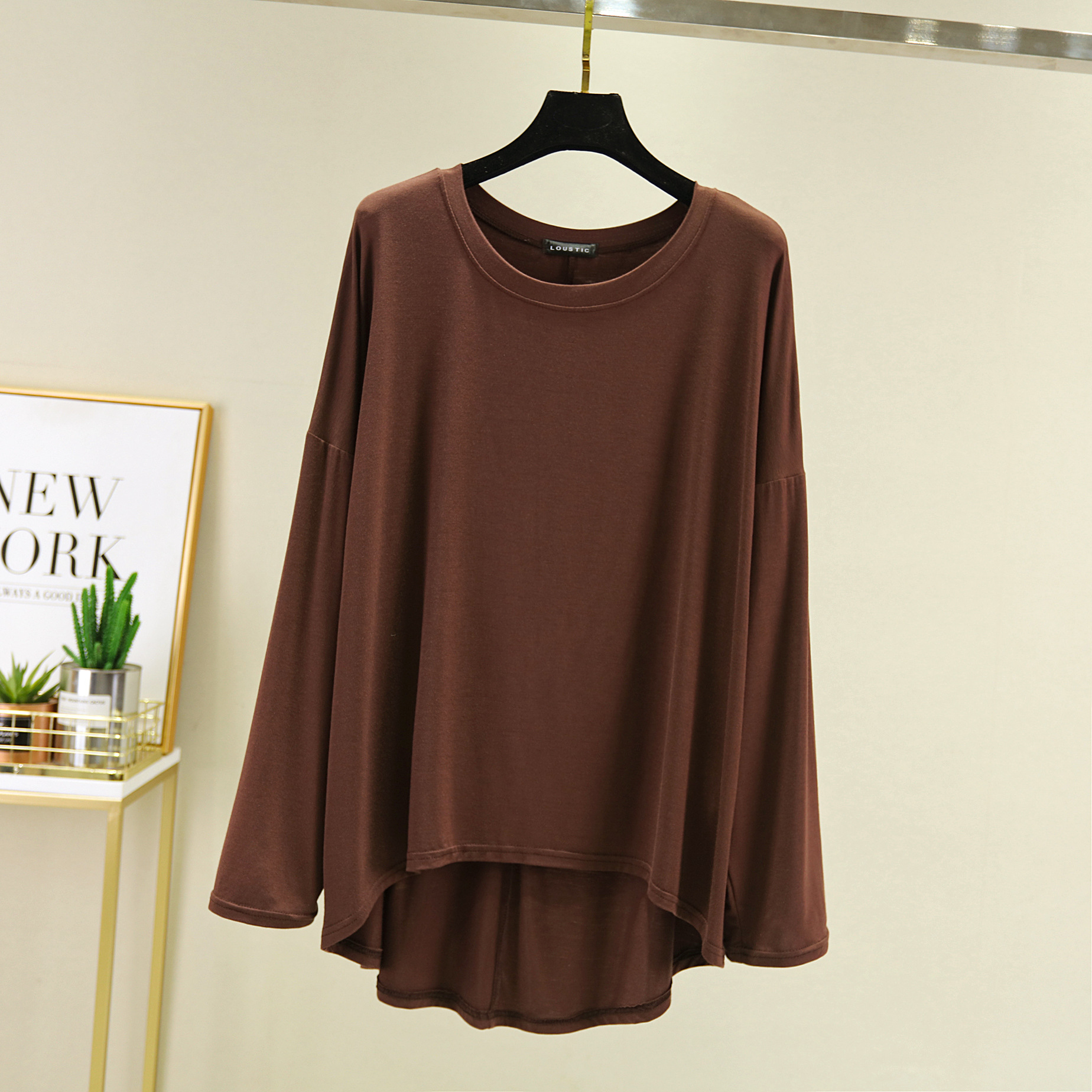 Осенняя Модальная футболка с длинными рукавами, Женская свободная тонкая футболка с круглым вырезом больших размеров, Базовая рубашка с толстой внутренней частью, Топ средней длины