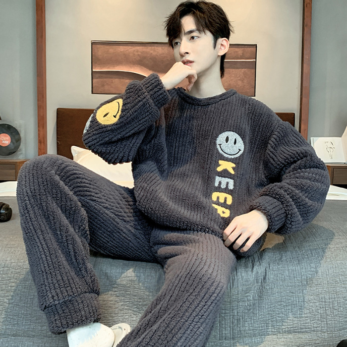 Коралловый бархатный пижама мужской осенью и зимой плюшевый набор с круглым вырезом