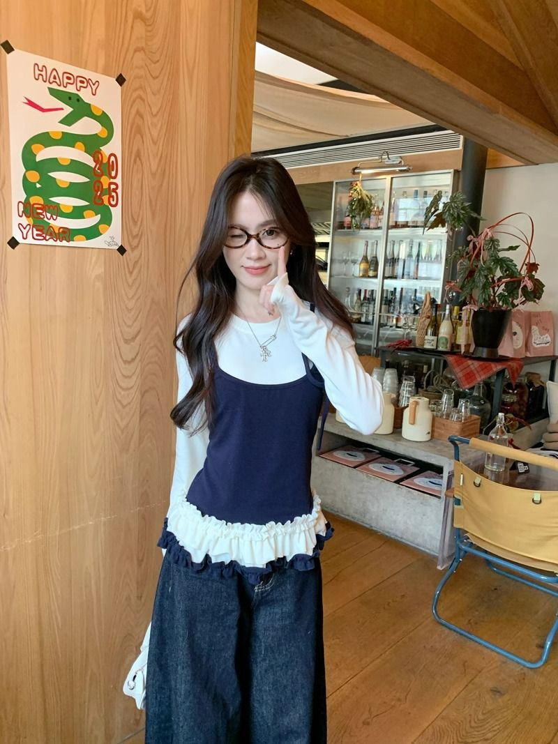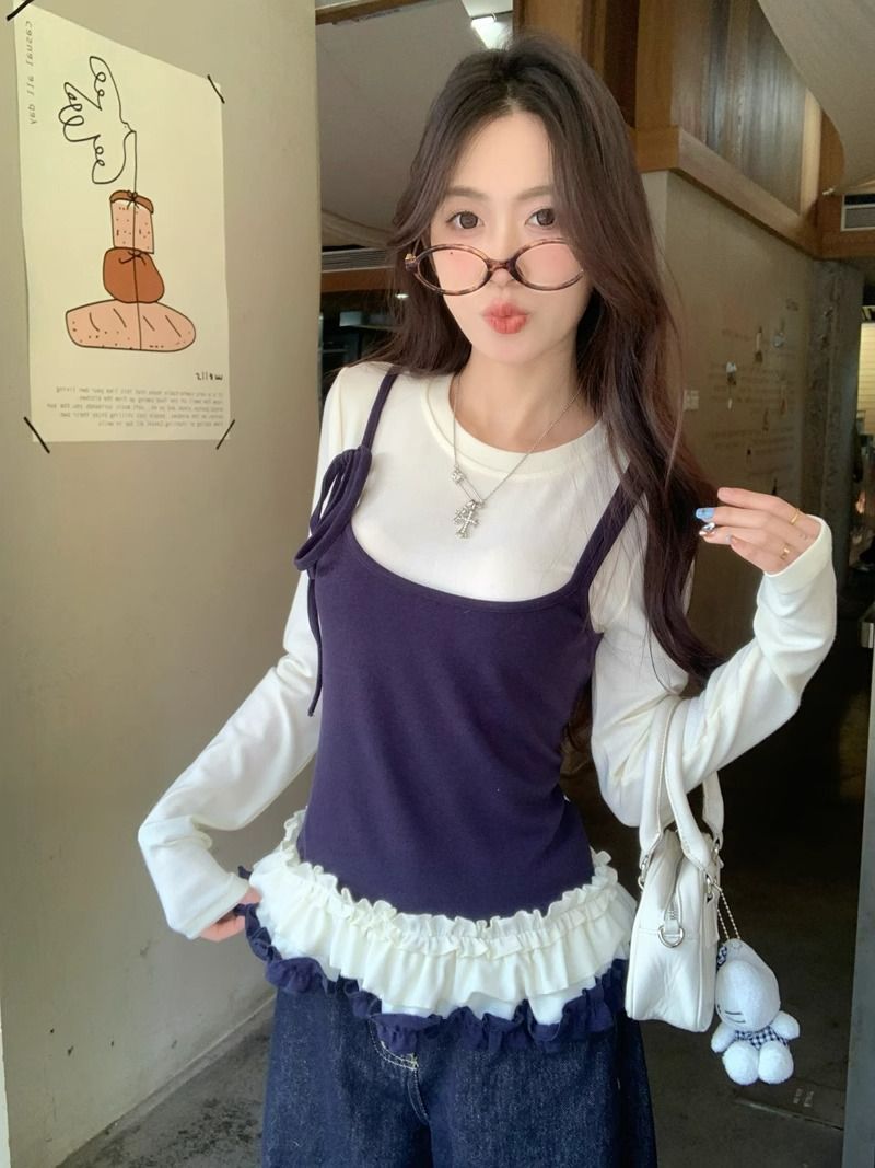Главная страница > Поддельные две контрастные футболки с длинными рукавами женская весна 2025 года талия нижняя рубашка с балетным кружевным топом