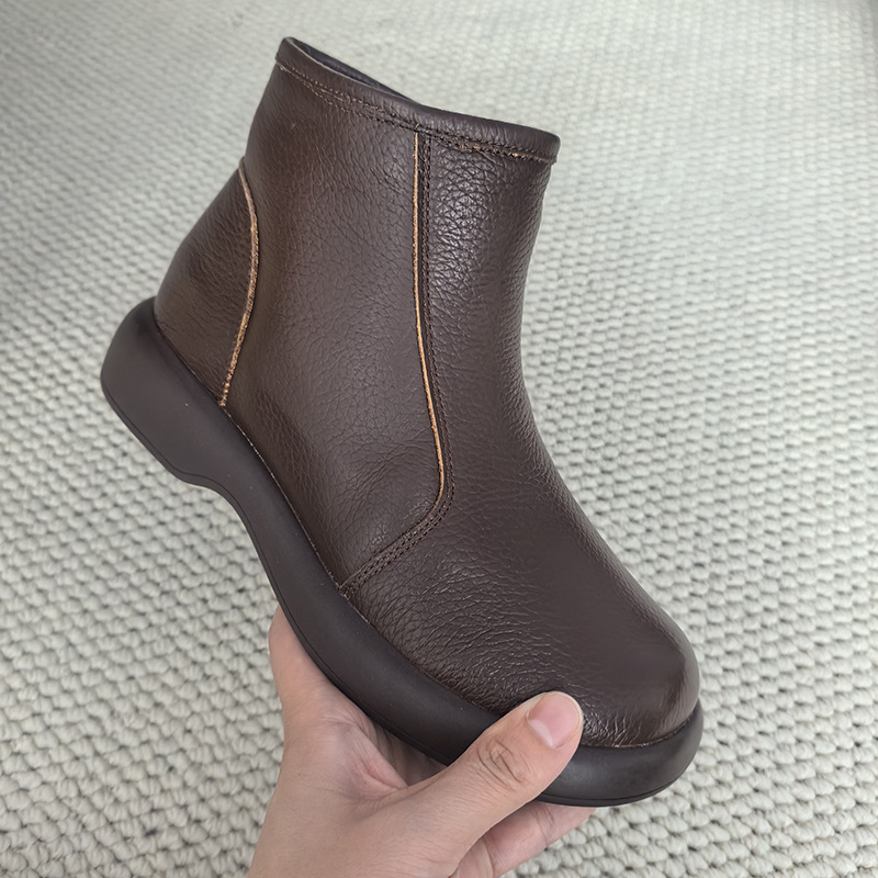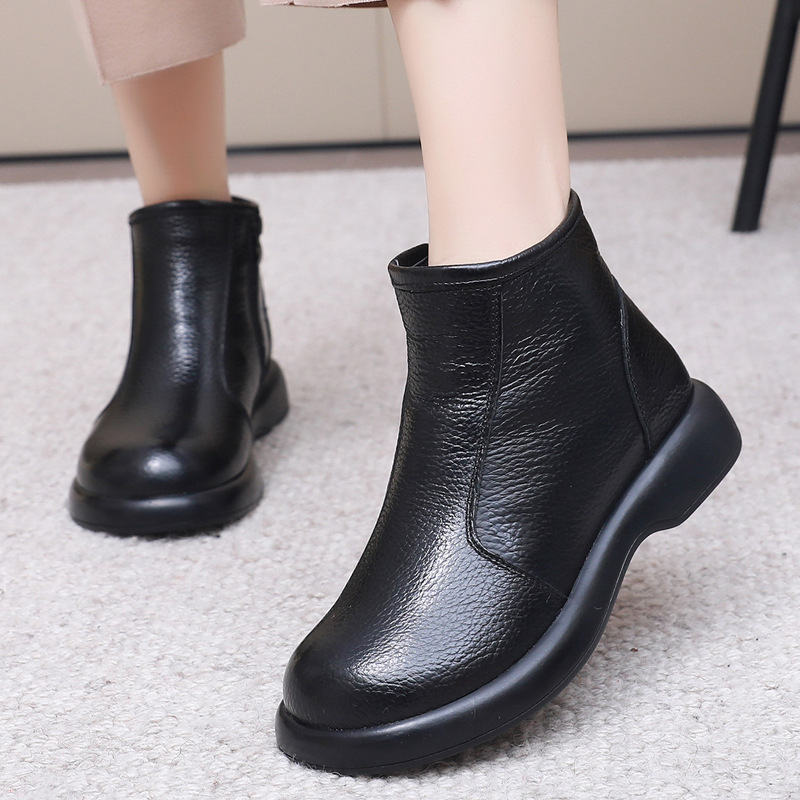 Листья головы воловьей кожи новый низкий каблуки ботинки Martin повседневные женские хлопчатобумажные ботинки кожаные сапоги круглые шерстяные мамочки