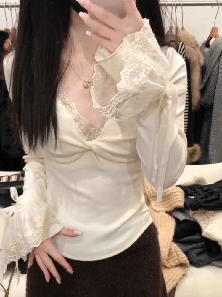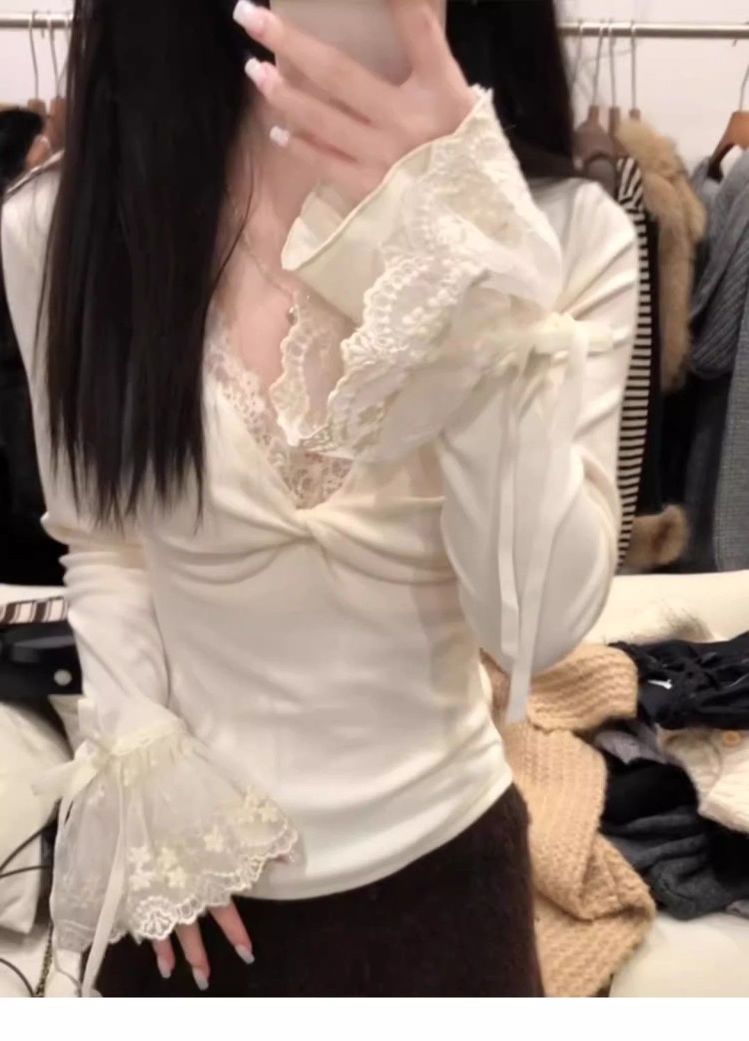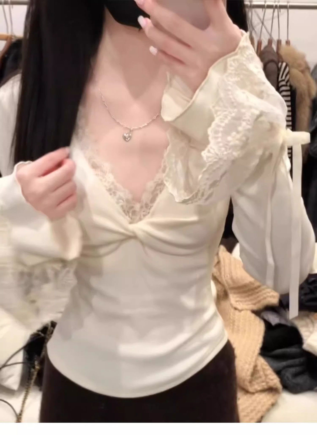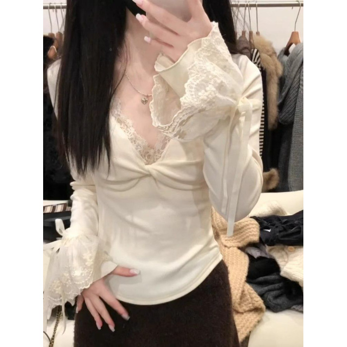 Главная страница > [270 н. э.] Кружевная V-образная футболка с длинным рукавом женская осенняя и зимняя тонкая рубашка