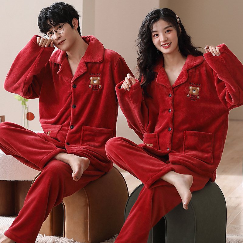 2 комплекта свадебных пар пижам осень и зима коралловый флис утолщенный красный один мужчина и одна женщина Свадебная одежда костюм