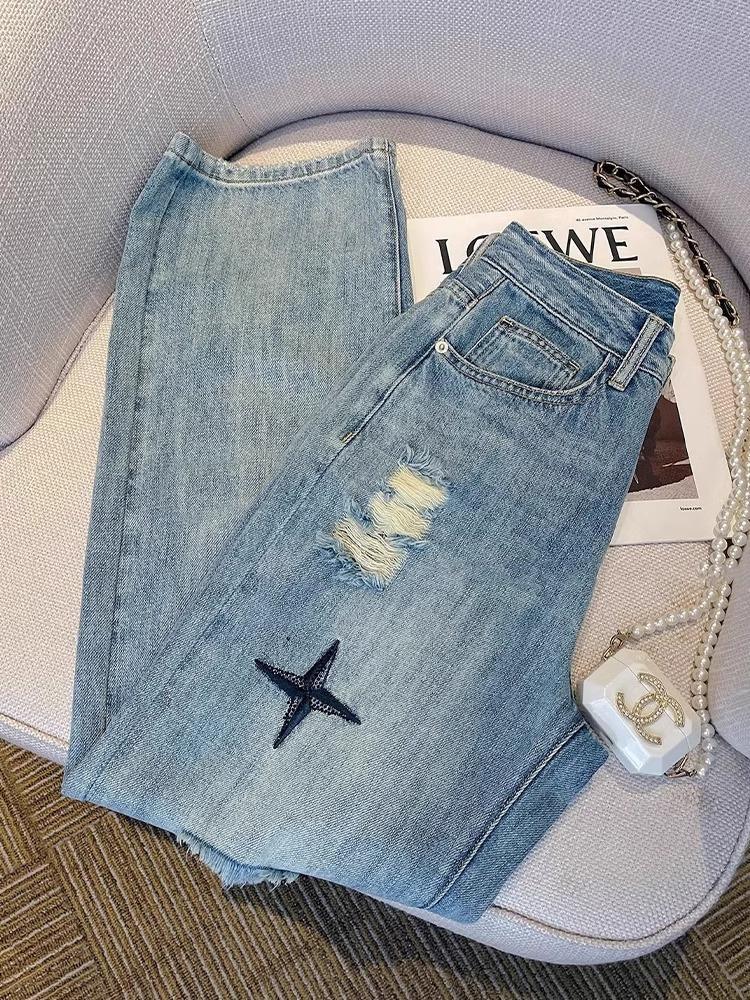 Главная страница > 2025 женские рваные джинсы больших размеров с вышивкой звезд, новые летние брюки, свободные широкие брюки для полных мм
