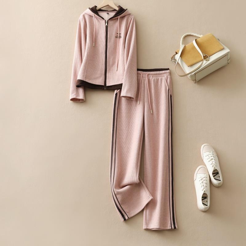 Спортивный набор для отдыха Весна и Осень 2025 Новая женская куртка с капюшоном Прямые брюки из двух частей розовая спортивная одежда