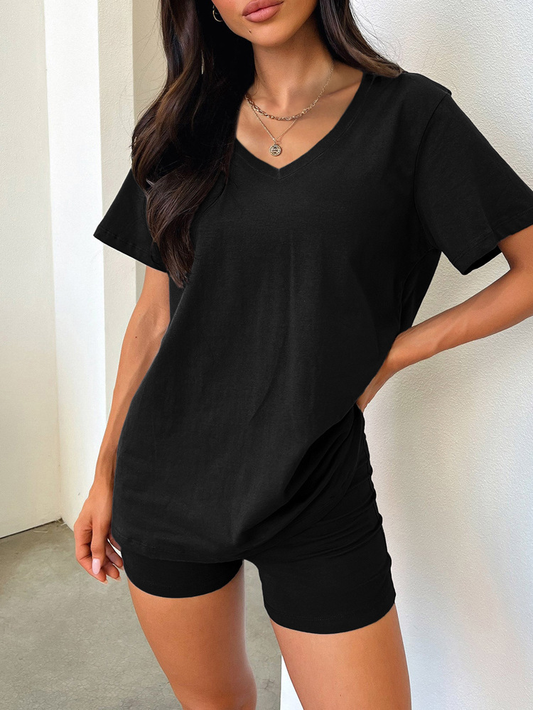 Главная страница > Европейская и американская независимая станция AliExpress 2025 с короткими рукавами, весна и лето, новый элегантный повседневный однотонный модный костюм с v-образным вырезом для женщин