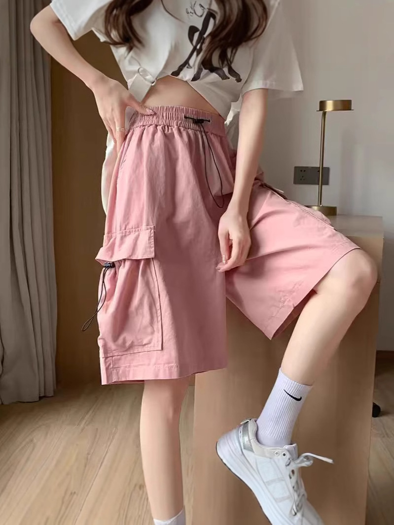 Винные шорты карго женские летние тонкие с высокой талией повседневные широкие ноги дизайн чувство быстрого сушки спортивные американские укороченные брюки