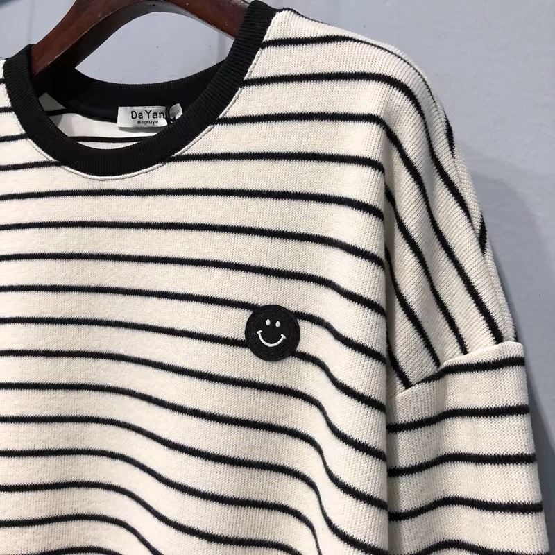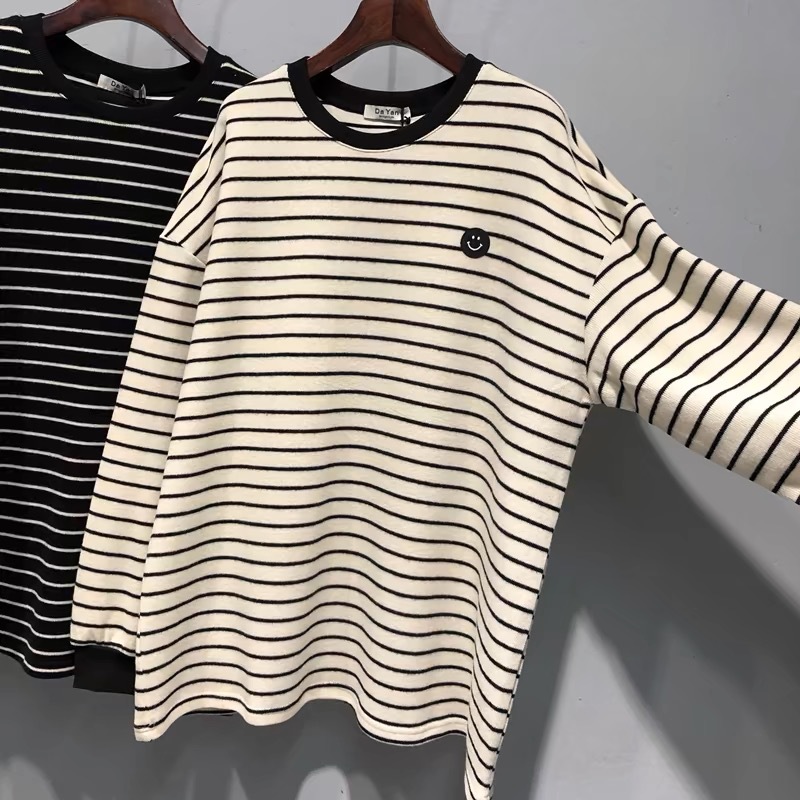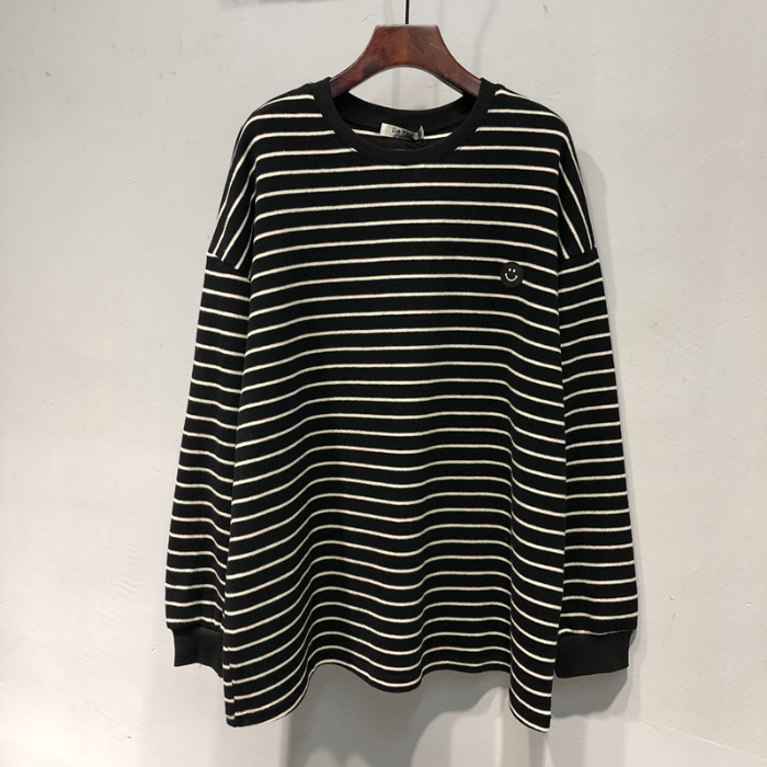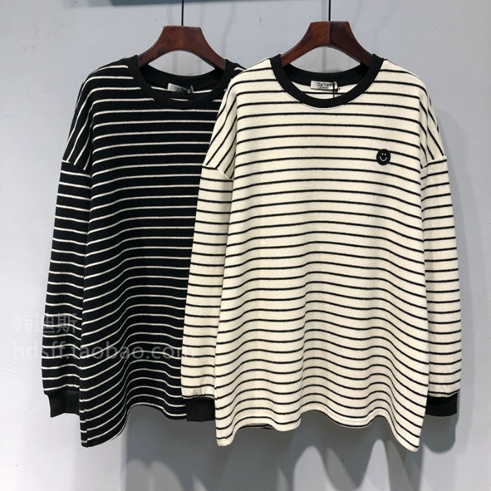24 осенние и зимние корейские новые свободные полосатые смайлики волосатые футболки с длинными рукавами женские дикие топы