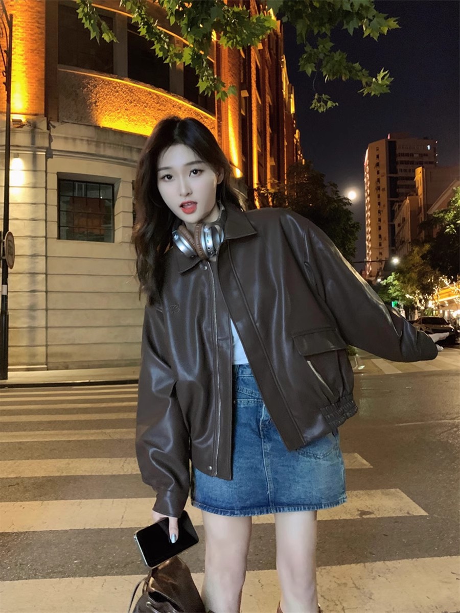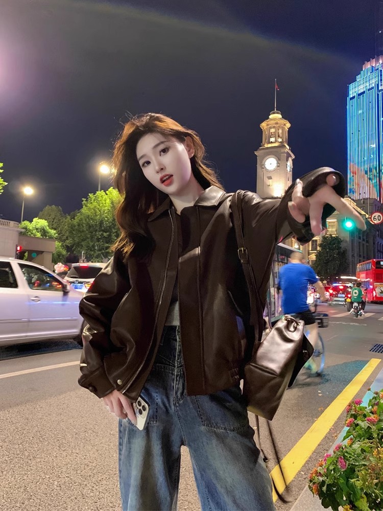 Главная страница > Гонконгский стиль ретро уличный тренд кожаная куртка женская весна и осень 2025 новый локомотив коричневый американский куртка топ женский