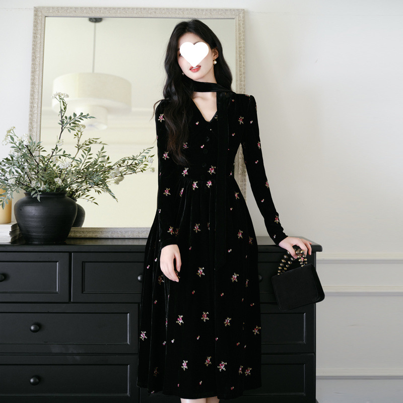 Главная страница > Осеннее и зимнее французское ретро черное бархатное платье темперамент светская богиня длинное платье