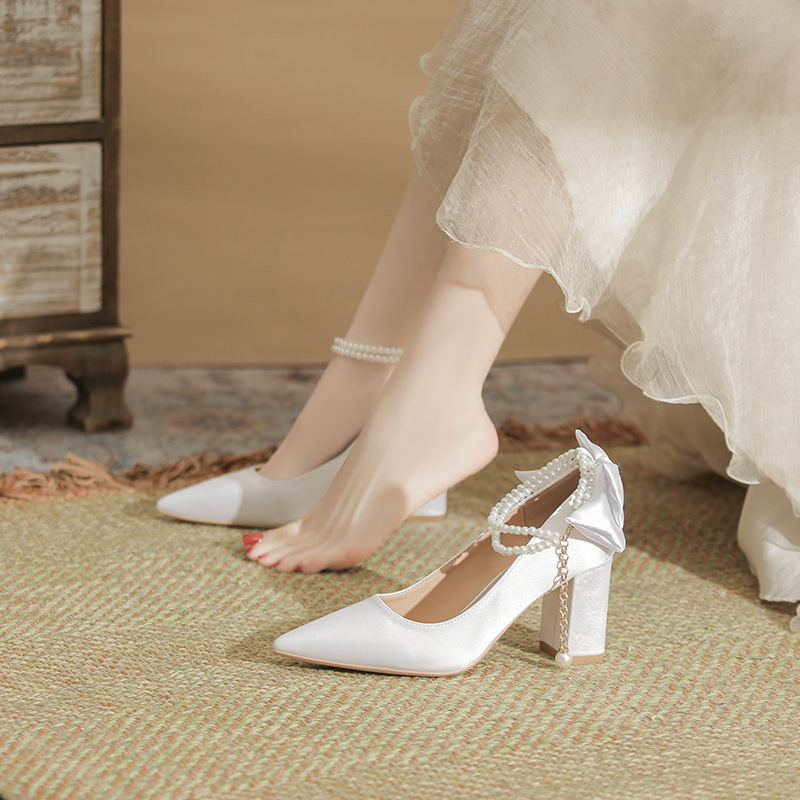 Французские атласные одиночные туфли для женщин можно носить белые подружки невесты с свадебными туфлями на высоких каблуках