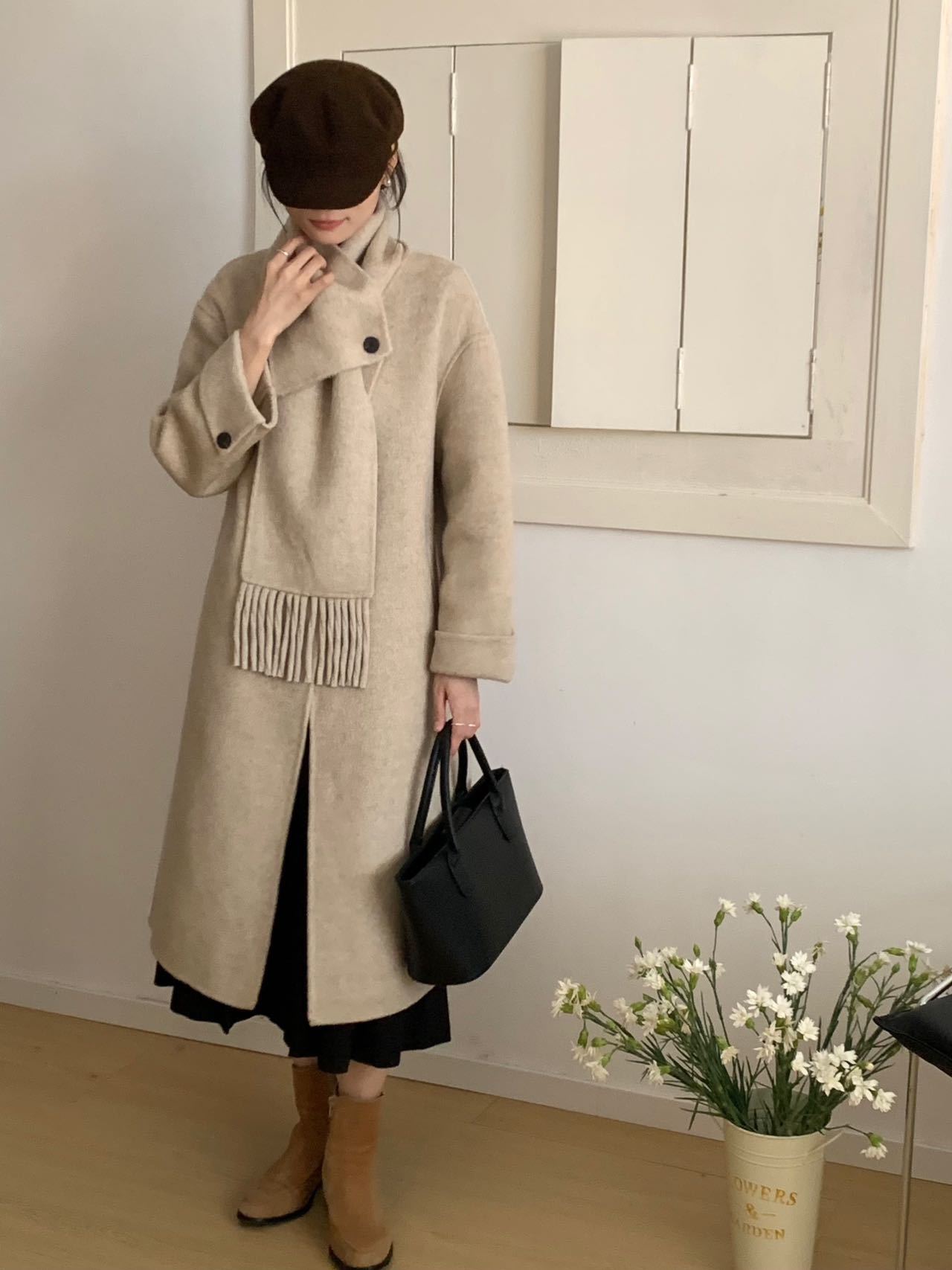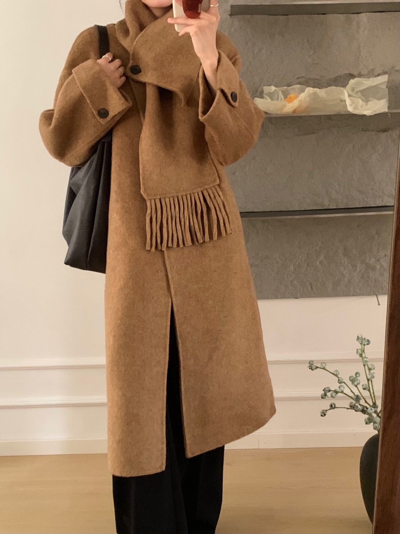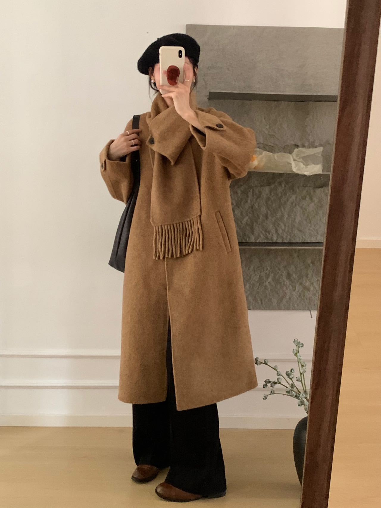 Главная страница > Корейский съемный шарф воротник 2024 новый двухсторонний шерстяной пальто женский колено досуг простой стиль шерстяной куртки