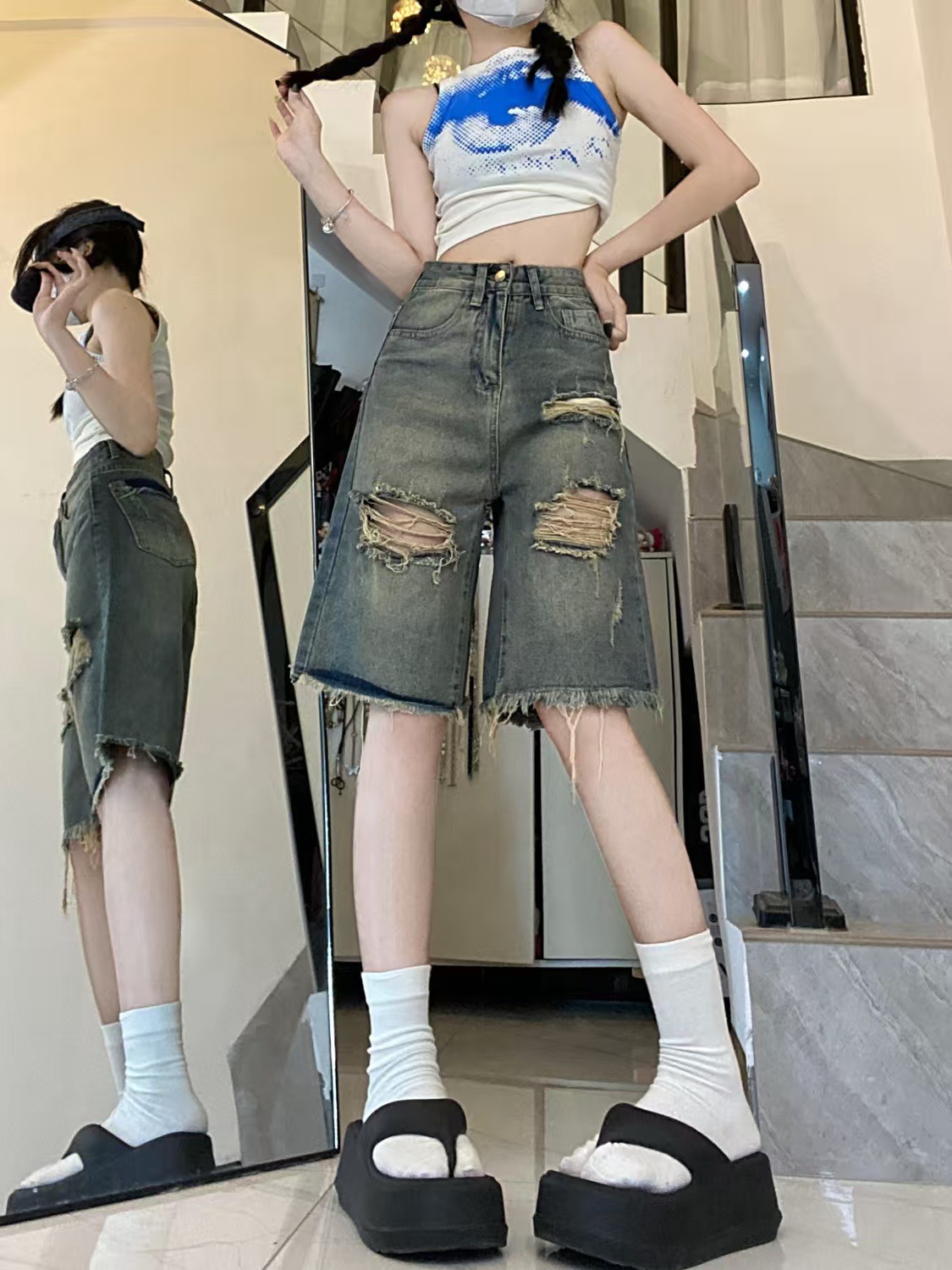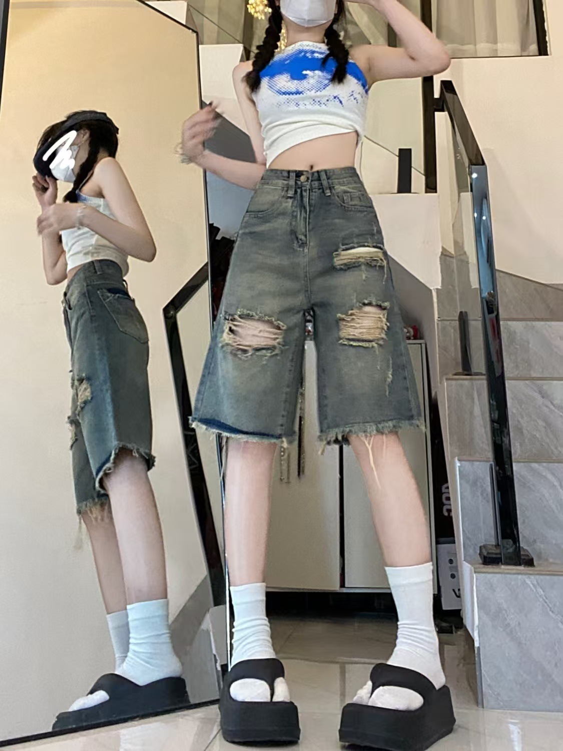 Главная страница > Рваные джинсы с пятью точками для женщин, летние новые свободные утягивающие брюки в стиле ретро в американском стиле, широкие брюки средней длины с уличным дизайном