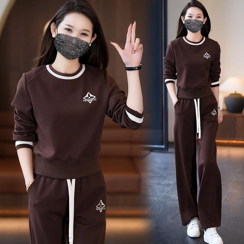 Европейская станция повседневная спортивная одежда набор дамы весенний и осенний свободный модный круглый воротник свитерская широкая нога брюки из двух частей