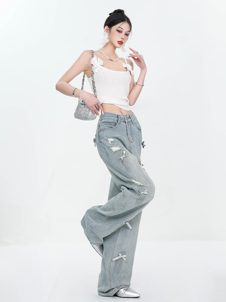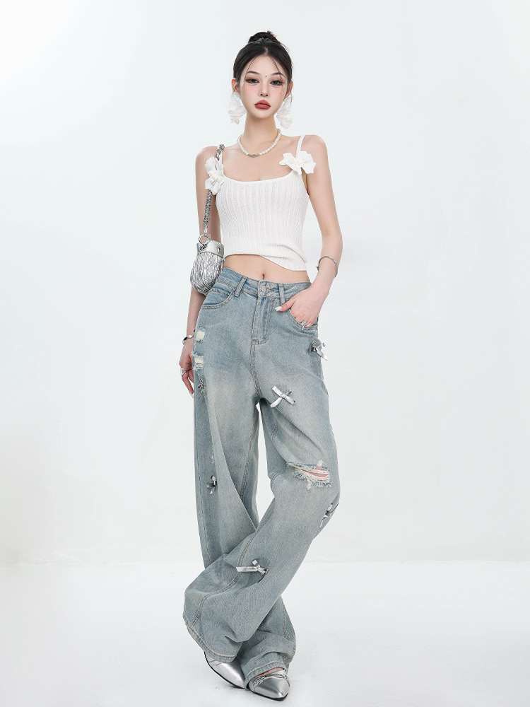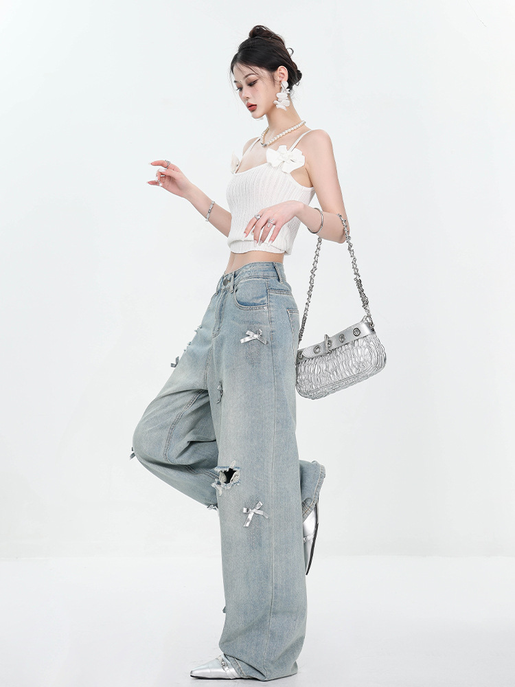 Главная страница > Ретро большого размера трехмерный лук с дырками джинсы женский летний дизайн с высокой талией прямые свободные широкие брюки