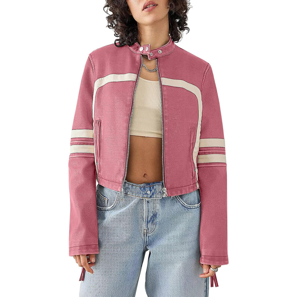 Главная страница > 2025 Европейская и американская модная кожаная куртка Amazon с контрастной строчкой, короткая женская кожаная куртка из искусственной кожи с открытой талией