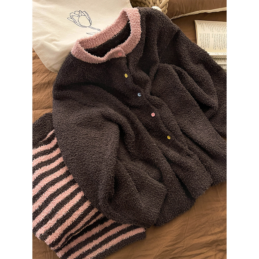 В наличии: Женский комплект домашней одежды из полуплюшевой трикотажной ткани в полоску, новая зимняя модель, подходит для выхода в свет, утолщенный и теплый.