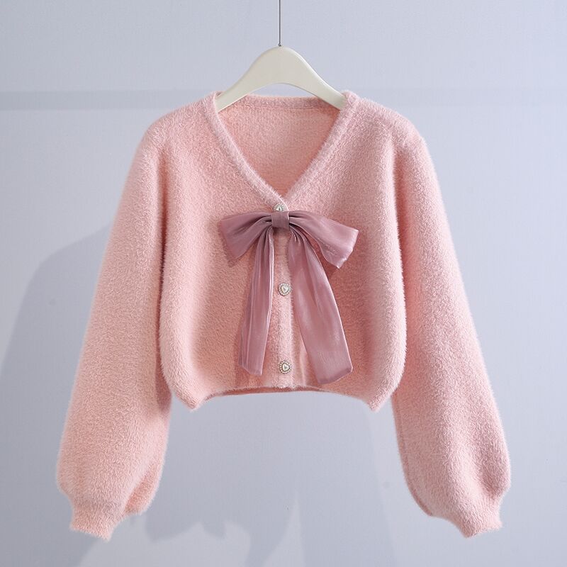 Трикотажный кардиган Короткий имитационный норковый бархатный свитер куртка женский 2023 осень и зима новый иностранный минус возраст свободный бант