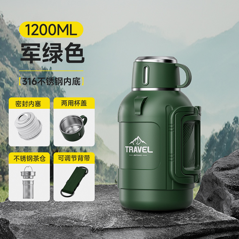 Военный зеленый цвет, 1200 мл, с плечевым ремнем и отделением для чая * одна крышка для двух целей.