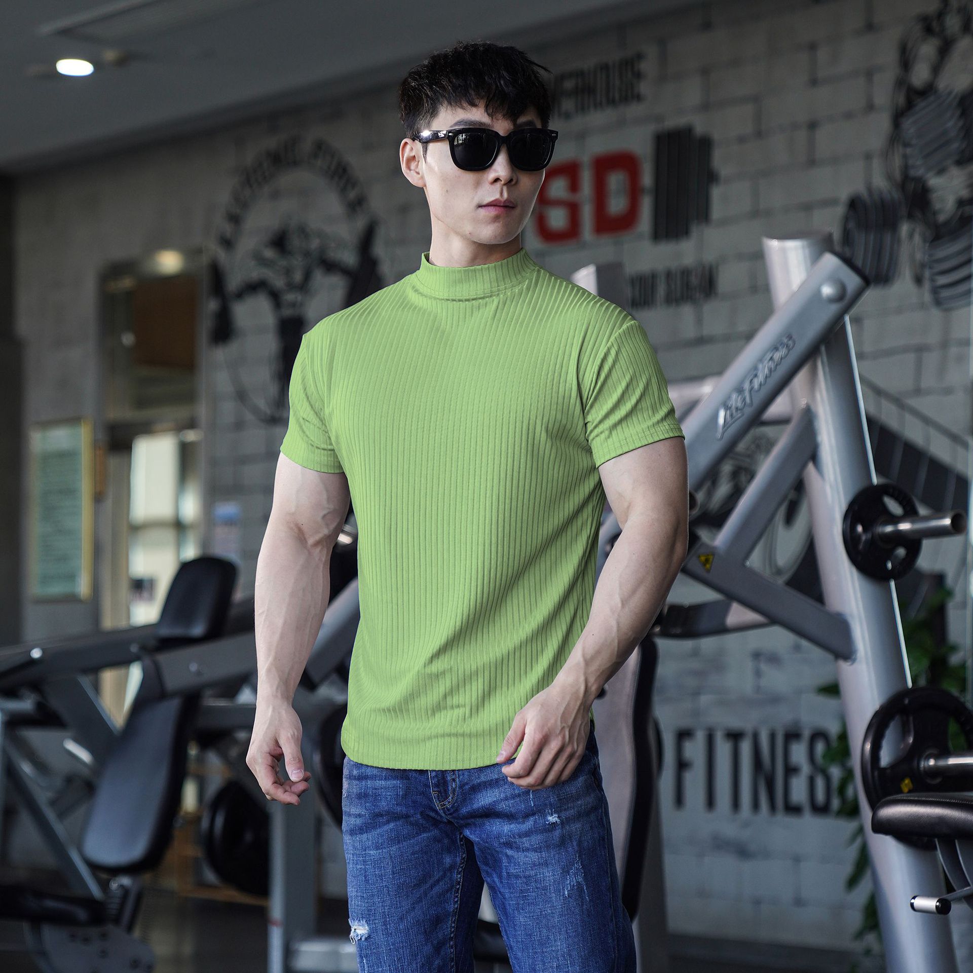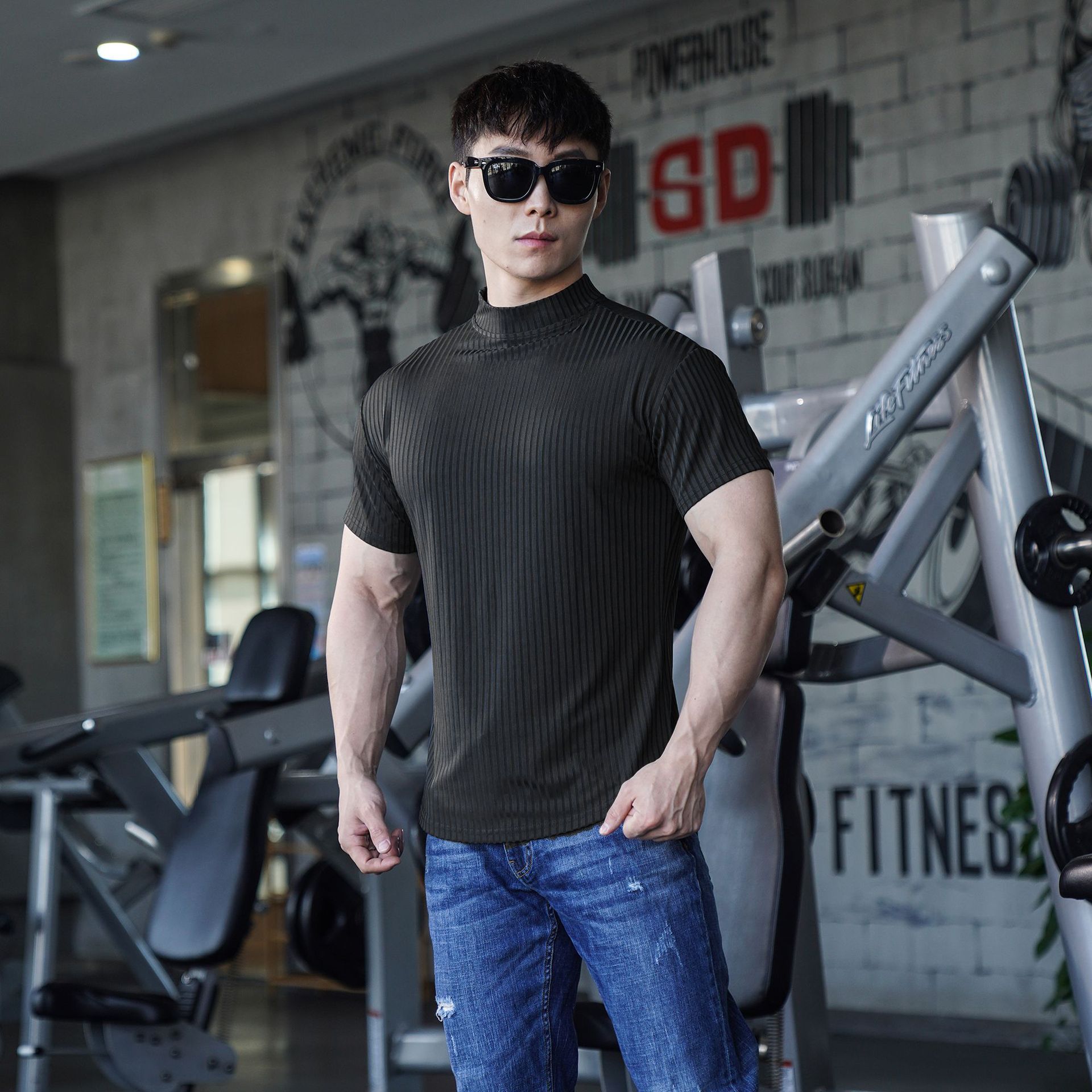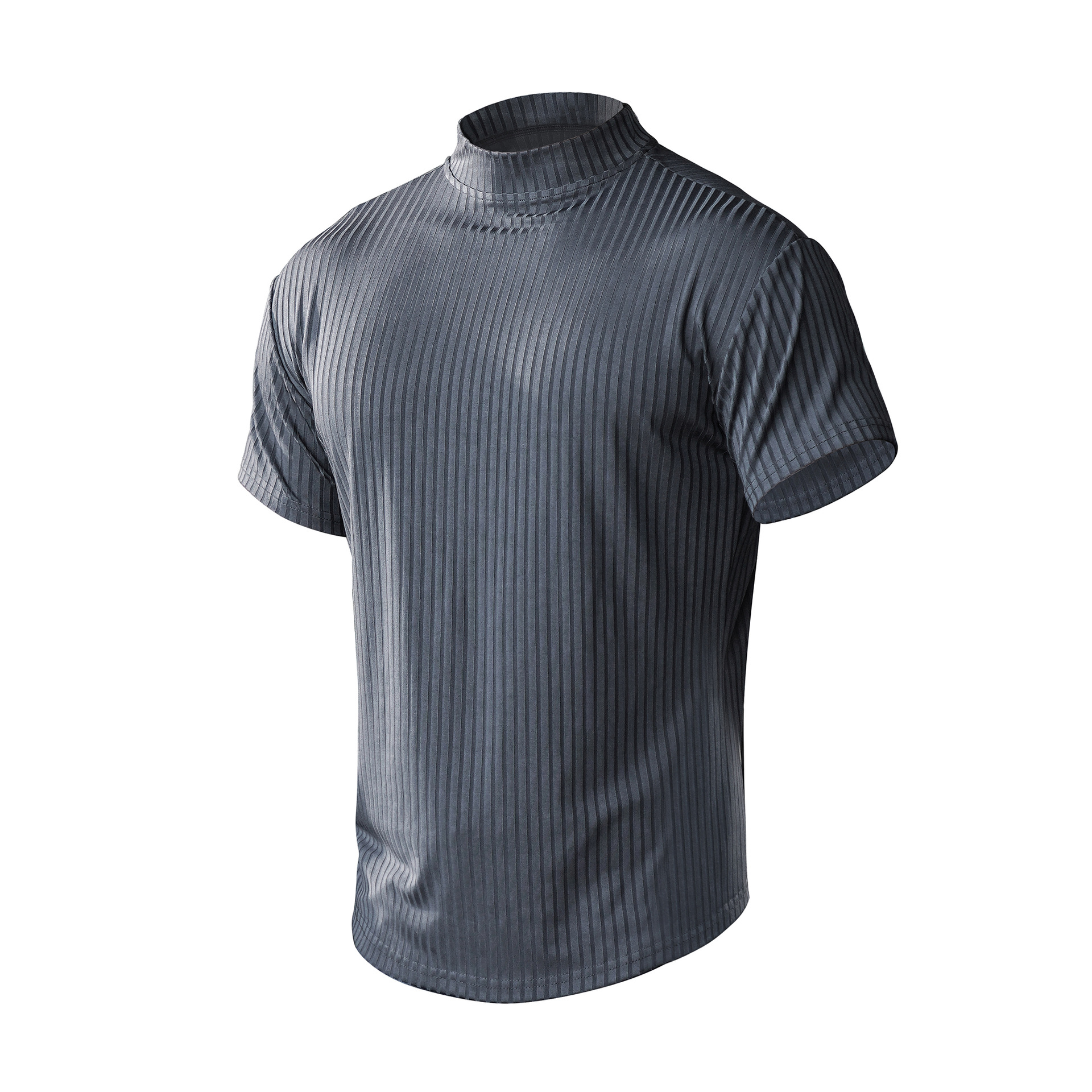 Летний Спорт Досуг из полиэстера, высокая Мужская футболка с круглым вырезом и коротким рукавом, фитнес, тонкая полосатая нить, новый стиль