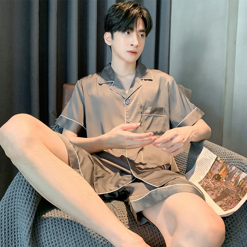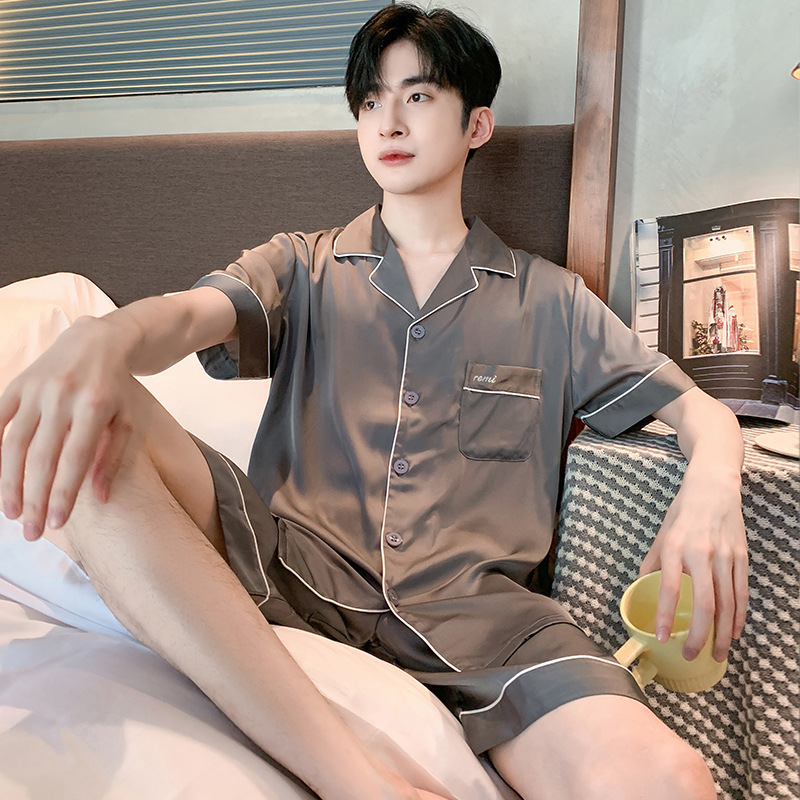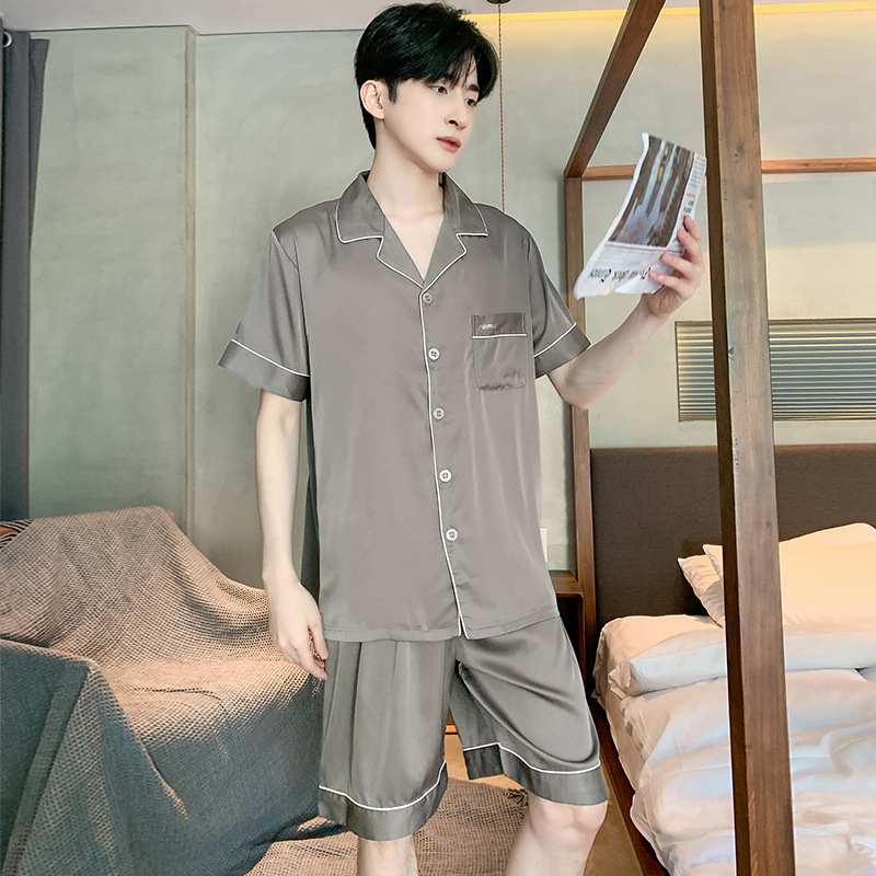 Главная страница > [На заказ] Летние прохладные пижамы из ледяного шелка для мужчин, тонкие с коротким рукавом, простой повседневный комплект для дома