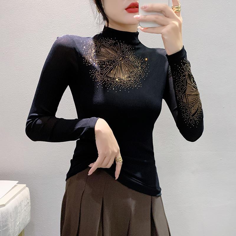 Главная страница > Европейская Осенняя новая Сетчатая футболка с высоким воротником и длинными рукавами, кружевная вышивка, Горячая сверление, Женская приталенная Базовая рубашка, модная