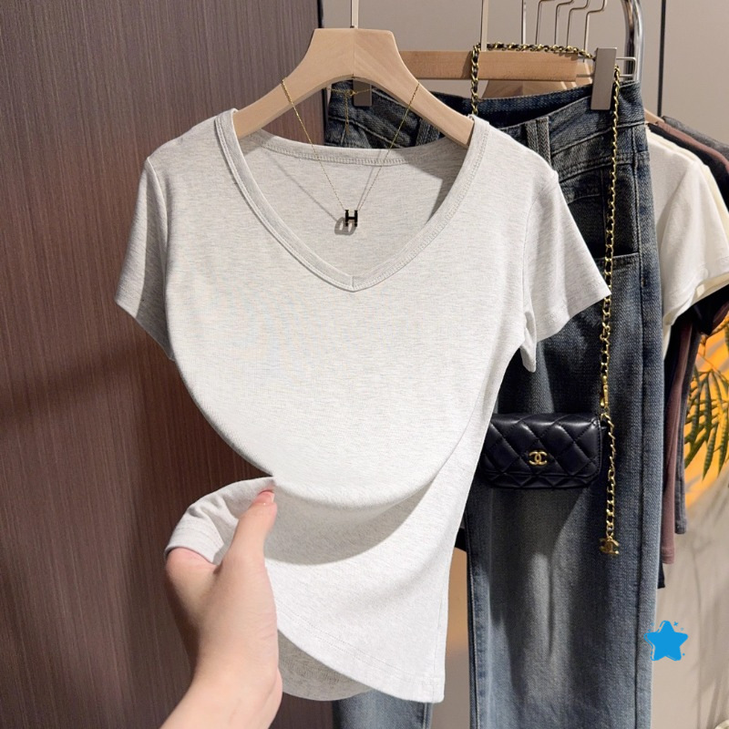 Главная страница > Серая футболка с v-образным вырезом для женщин с короткими рукавами и тонким плечом