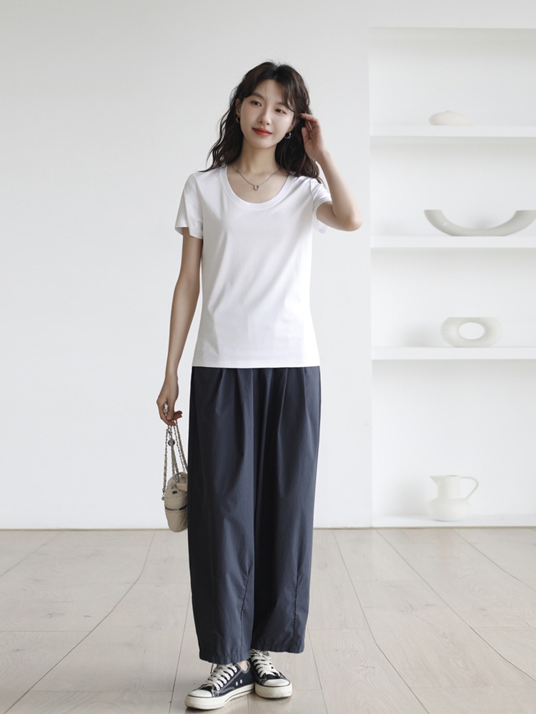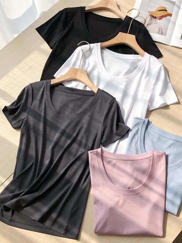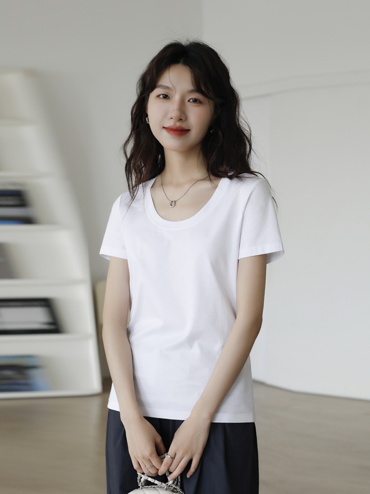 Главная страница > Женская футболка с короткими рукавами, большим круглым вырезом, открытым ключицей, обычным плечом, верхняя одежда, базовый топ из шелкового шелка.