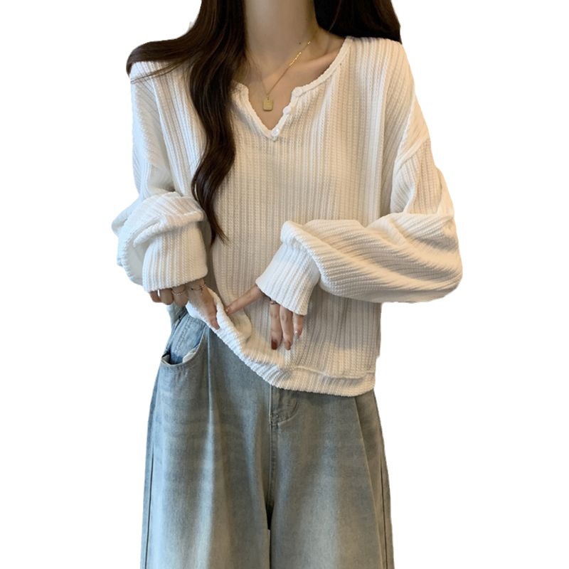 Главная страница > Женская футболка-рубашка с V-образным вырезом и узором на подоле, Новый Свободный Топ средней длины для похудения больших размеров на весну, осень и зиму