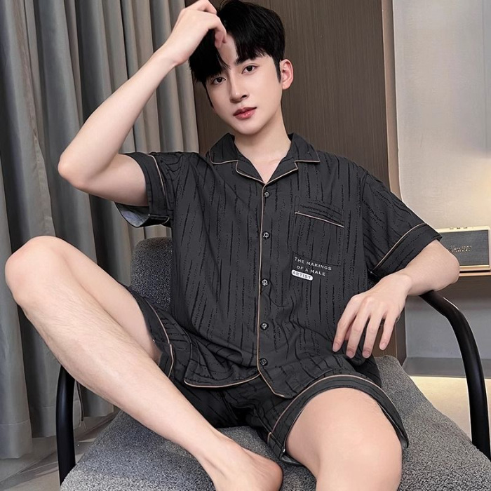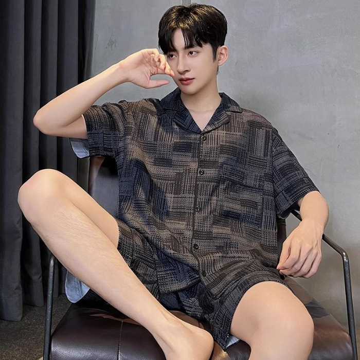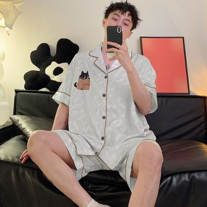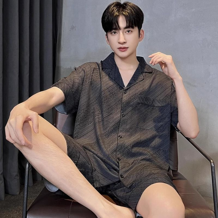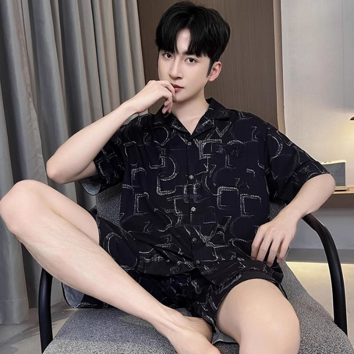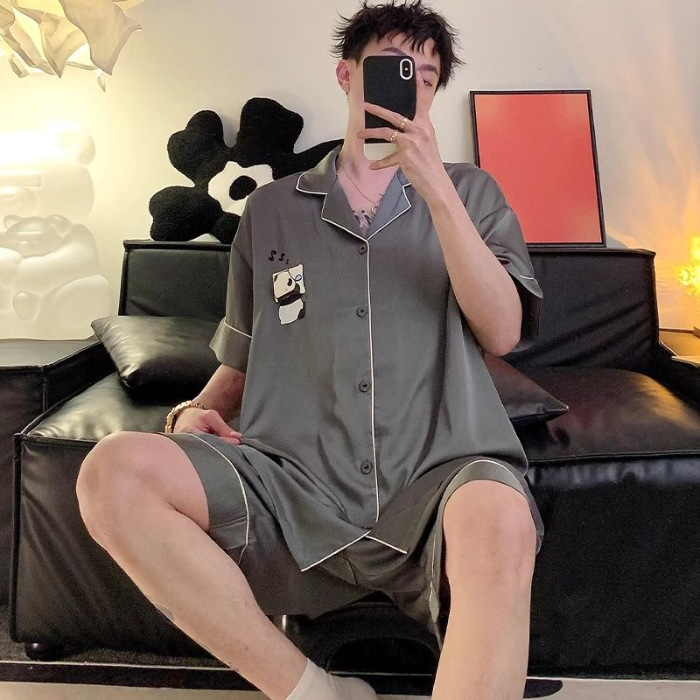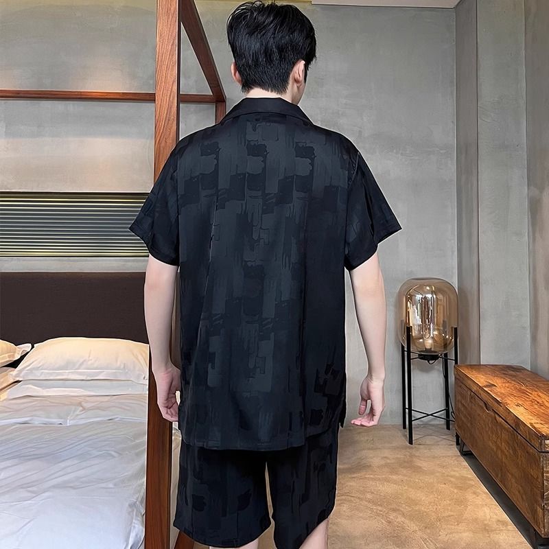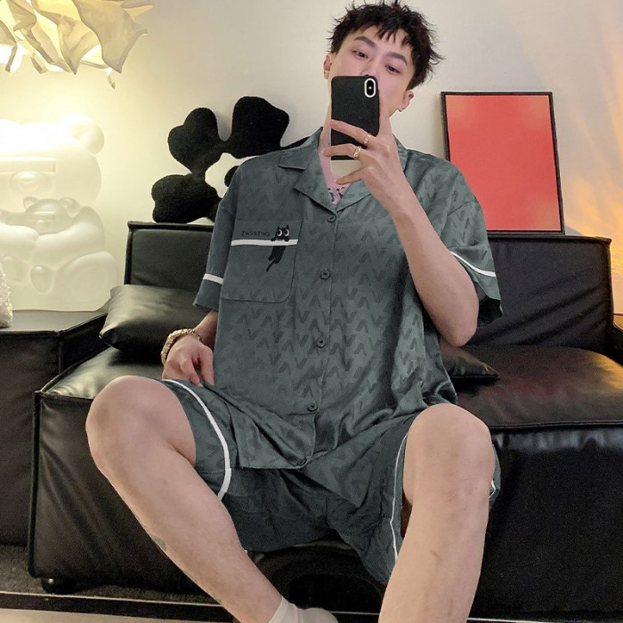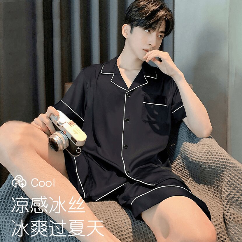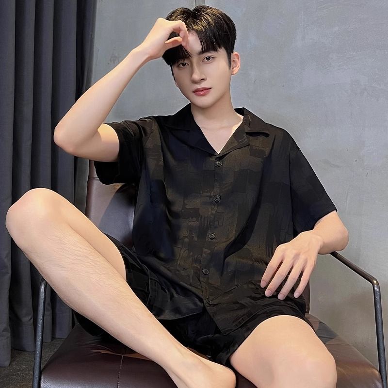 Главная страница > 2025 новые пижамы мужские из ледяного шелка летние повседневные свободные с коротким рукавом шорты кардиган удобная домашняя одежда комплект из двух предметов