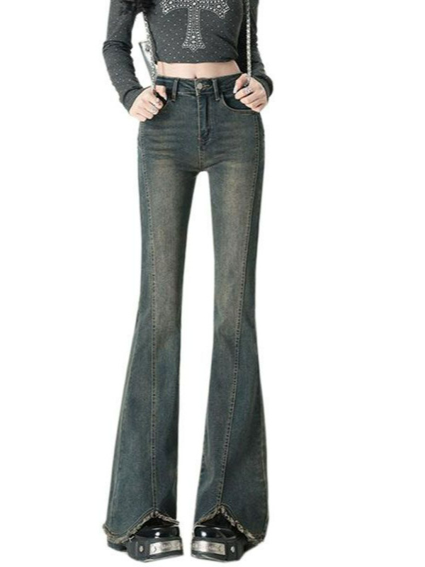 Главная страница > Винтажные расклешенные джинсы с разрезом для женщин, весна/лето, миниатюрная высокая талия, эластичные утягивающие брюки, грушевидная фигура, расклешенные брюки с потертым краем.