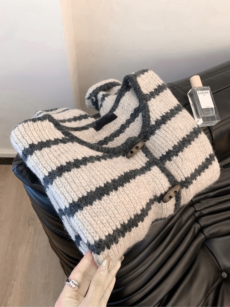 Главная страница > Кнопка 2025, новый короткий трикотажный кардиган, европейский ретро-полосатый трикотаж, женская осенне-зимняя куртка в ленивом стиле