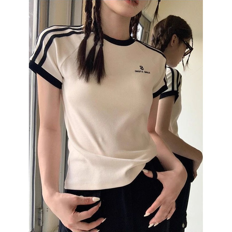 Корейская футболка с рукавами на плече для девочек с короткими рукавами дизайн в полоску