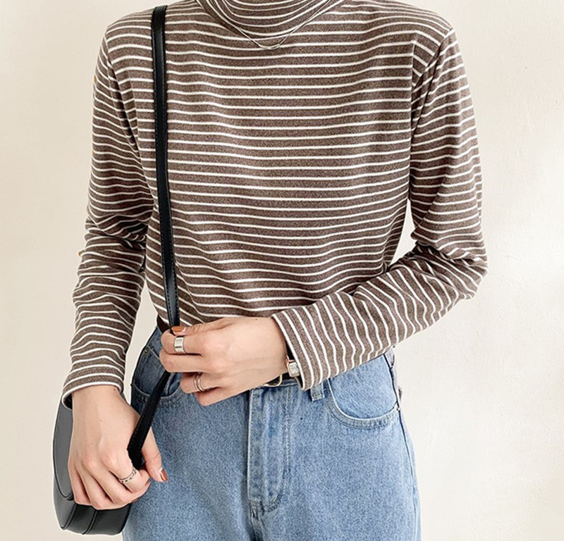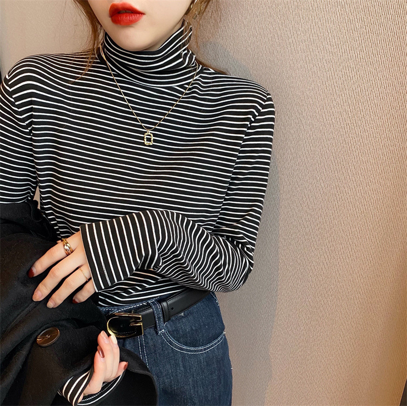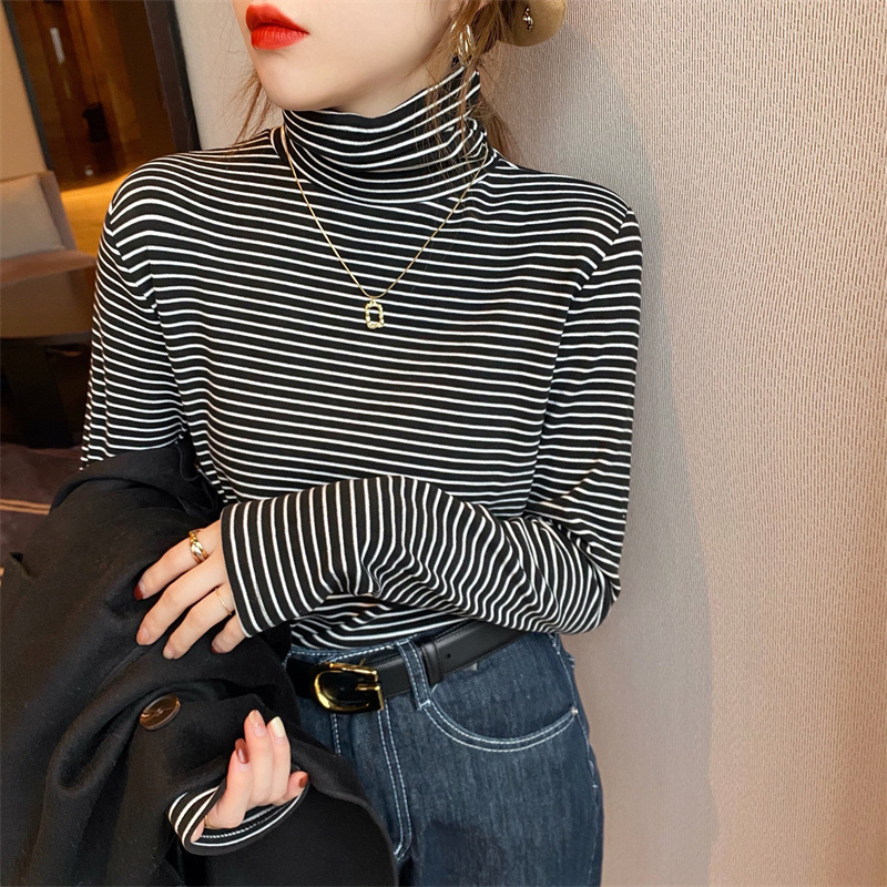 Главная страница > Фабрика прямых продаж двухсторонняя дебархатная куча с высоким воротником нижняя рубашка женская футболка с бархатной утолщением в полоску с длинными рукавами осенью и зимой