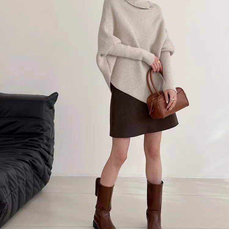 Главная страница > Женский свитер с асимметричным воротником-стойкой, новинка осени-зимы 2025, в корейском стиле, свободного кроя, с рукавами «летучая мышь», утепленный вязаный топ