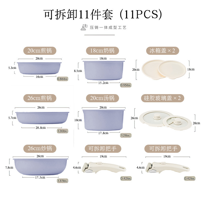 Фиолетовый набор из 11 предметов (кастрюля*5+силиконовая стеклянная крышка*2+крышка холодильника*2+съемная ручка*2)